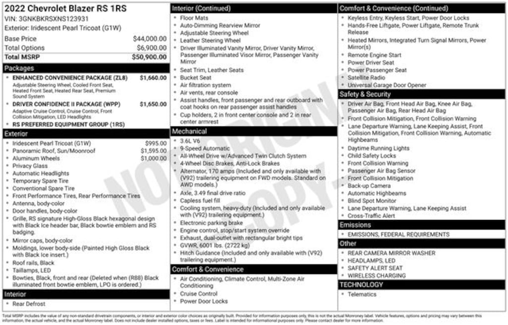 CLEAN CARFAX, AWD, 3.6L V6, AUTOMATIC, ENHANCED CONVENIENCE PACKAGE, DRIVER CONFIDENCE II PACKAGE, POWER PANORAMIC SUNROOF, BOSE PREMIUM 8 SPEAKER AUDIO, 8" COLOR TOUCH SCREEN WITH NAVIGATON, JET BLACK LEATHER, HEATED/COOLED SEATS, POWER SEATS, HEATED REAR SEATS, REMOTE START, HEATED STEERING WHEEL, REAR VIEW CAMERA, HANDS FREE POWER LIFTGATE, LANE KEEP ASSIST, LANE DEPARTURE WARNING, FRONT PEDESTRIAN BRAKING, FORWARD COLLISION ALERT, REAR PARK ASSIST, REAR CROSS TRAFFIC ALERT, BLUETOOTH, SIRIUSXM, WIRELESS APPLE CARPLAY & ANDROID AUTO, WIRELESS PHONE CHARGING, ADAPTIVE CRUISE CONTROL, LED HEADLAMPS, SURROUND VISION, AUTOMATIC EMERGENCY BRAKING, BLACK TWO TONE ROOF, 21" GLOSS BLACK ALUMINUM WHEELS, 3.49 Final Drive Axle Ratio, 4-Wheel Disc Brakes, 6-Way Power Front Passenger Seat Adjuster, ABS brakes, Adaptive Cruise Control, Air Conditioning, AM/FM radio: SiriusXM with 360L, Apple CarPlay/Android Auto, Auto High-beam Headlights, Auto-dimming door mirrors, Auto-dimming Rear-View mirror, Automatic temperature control, Black 2-Tone Roof, Brake assist, Bumpers: body-color, Child-Seat-Sensing Airbag, Compass, Delay-off headlights, Driver Confidence II Package, Driver door bin, Driver vanity mirror, Dual front impact airbags, Dual front side impact airbags, Electronic Stability Control, Emergency communication system: OnStar and Chevrolet connected services capable, Enhanced Automatic Emergency Braking, Enhanced Convenience Package, Exterior Parking Camera Rear, Four wheel independent suspension, Front Bucket Seats, Front Center Armrest, Front dual zone A/C, Front reading lights, Fully automatic headlights, Garage door transmitter, HD Surround Vision, Heated door mirrors, Heated Driver & Front Passenger Seats, Heated Rear Outboard Seating Positions, Heated Steering Wheel, High-Intensity Discharge Headlights, Illuminated entry, Knee airbag, Leather Shift Knob, LED Headlamps, Low tire pressure warning, Memory Settings For Driver Seat & Exterior Mirrors, Navigation System, Occupant sensing airbag, Outside temperature display, Overhead airbag, Overhead console, Panic alarm, Passenger door bin, Passenger vanity mirror, Perforated Leather-Appointed Seat Trim, Power door mirrors, Power Liftgate, Power Panoramic Tilt-Sliding Sunroof, Power passenger seat, Power steering, Power Tilt & Telescoping Steering Column, Power windows, Preferred Equipment Group 1RS, Radio data system, Radio: Chevrolet Infotainment 3 Plus System, Rear Camera Mirror, Rear Camera Mirror Washer, Rear reading lights, Rear seat center armrest, Rear window defroster, Rear window wiper, Remote keyless entry, Ride & Handling Suspension, Safety Alert Seat, Security system, SiriusXM w/360L, Speed-sensing steering, Split folding rear seat, Spoiler, Steering wheel mounted audio controls, Telescoping steering wheel, Tilt steering wheel, Traction control, Turn signal indicator mirrors, Variably intermittent wipers, Ventilated Driver & Front Passenger Seats, Wheels: 21" Gloss Black Aluminum, Wireless Charging. 19/26 City/Highway MPG