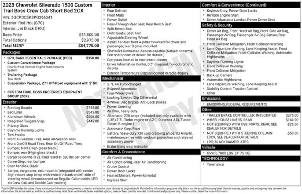 STELLANTIS GO CERTIFIED PREOWNED, ONE OWNER, LOCAL TRADE, CLEAN CARFAX, 4WD, 2.7L TURBO HIGH OUTPUT, AUTOMATIC, CUSTOM CONVENIENCE PACKAGE, DARK ESSENTIALS PACKAGE, 2CX PACKAGE, SUSPENSION PACKAGE, TRAILERING PACKAGE, 20" GLOSS BLACK PAINTED ALUMINUM WHEELS, MULTIFLEX TAILGATE, TOW HICH, TRAILER BRAKE CONTROLLER, CHEVYTEC SPRAY ON BEDLINER, BLACK TUBULAR ASSIST STEPS, TOW HITCH, REAR WHEELHOUSE LINERS, AUTOMATIC EMERGENCY BRAKING, FORWARD COLLISION ALERT, FRONT PEDESTRIAN BRAKING, LANE KEEP ASSIST WITH LANE DEPARTURE WARNING, FOLLOWING DISTANCE INDICATOR, AUTO HIGH BEAM, REMOTE START, REMOTE KEYLESS ENTRY, REAR VISION CAMERA, Z71 OFF ROAD PACKAGE WITH 2" LIFT, 7" COLOR TOUCH SCREEN, BLUETOOTH, SIRIUSXM, APPLE CARPLAY & ANDROID AUTO, JET BLACK CLOTH BENCH SEAT, POWER SEAT, 10-Way Power Driver Seat w/Lumbar, 120-Volt Bed Mounted Power Outlet, 3.42 Rear Axle Ratio, 3.5" Monochromatic Display Driver Info Center, 4-Wheel Disc Brakes, 40/20/40 Front Split-Bench Seat, 6 Speakers, 6" Rectangular Black Tubular Assist Steps (LPO), ABS brakes, Air Conditioning, AM/FM radio: SiriusXM, Apple CarPlay/Android Auto, Auto High-beam Headlights, Auto-Locking Rear Differential, Automatic Emergency Braking, Black Name Plates (LPO), Bluetooth® For Phone, Brake assist, Chevrolet Connected Access Capable, Chevytec Spray-On Black Bedliner, Cloth Seat Trim, Color-Keyed Carpeting Floor Covering, Compass, Custom Convenience Package, Dark Essentials Package (LPO), Deep-Tinted Glass, Delay-off headlights, Driver door bin, Driver vanity mirror, Dual front impact airbags, Dual front side impact airbags, Electric Rear-Window Defogger, Electrical Steering Column Lock, Electronic Cruise Control, Electronic Stability Control, EZ Lift Power Lock & Release Tailgate, Following Distance Indicator, Forward Collision Alert, Front Center Armrest w/Storage, Front Pedestrian Braking, Front reading lights, Front Rubberized Vinyl Floor Mats, Front wheel independent suspension, Fully automatic headlights, HD Rear Vision Camera, Heated door mirrors, Heavy-Duty Air Filter, Hill Descent Control, Hitch Guidance, Illuminated entry, Integrated Trailer Brake Controller, IntelliBeam Automatic High Beam On/Off, Lane Keep Assist w/Lane Departure Warning, LED Cargo Area Lighting, Low tire pressure warning, Manual Tilt Wheel Steering Column, Manual Tilt/Telescoping Steering Column (DISC), Multi-Flex Tailgate, Occupant sensing airbag, OnStar & Chevrolet Connected Services Capable, Outside temperature display, Overhead airbag, Overhead console, Panic alarm, Passenger door bin, Passenger vanity mirror, Performance Red Recovery Hooks, Power door mirrors, Power driver seat, Power Front Windows w/Driver Express Up/Down, Power Front Windows w/Passenger Express Down, Power Rear Windows w/Express Down, Power steering, Power windows, Preferred Equipment Group 2CX, Premium audio system: Chevrolet Infotainment 3, Radio data system, Radio: Chevrolet Infotainment 3 System, Rear 60/40 Folding Bench Seat (Folds Up), Rear reading lights, Rear Rubberized-Vinyl Floor Mats, Rear step bumper, Rear Wheelhouse Liners, Rear window defroster, Remote Keyless Entry, Remote Vehicle Starter System, Security system, SiriusXM Radio, Speed-sensing steering, Split folding rear seat, Standard Tailgate, Suspension Package, Theft Deterrent System (Unauthorized Entry), Tilt steering wheel, Traction control, Trailering Package, Variably intermittent wipers, Wheels: 20" x 9" High Gloss Black Painted Alum, Wi-Fi Hot Spot Capable, Wireless Phone Projection. Odometer is 7461 miles below market average!