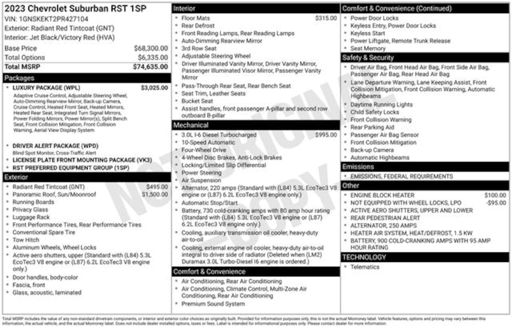 STELLANTIS GO CERTIFIED PREOWNED, ONE OWNER, LOCAL TRADE, CLEAN CARFAX, 4WD, 3.0L I6 DURAMAX TURBO DIESEL, AUTOMATIC, LUXURY PACKAGE, DRIVER ALERT PACKAGE, 1SP GROUP, TRAILERING EQUIPMENT, POWER PANORAMIC SUNROOF, NAVIGATION, LEATHER, HEATED SEATS, POWER SEATS, 2ND ROW BENCH SEAT, HEATED 2ND ROW SEATS, 3RD ROW SEAT, HEATED STEERING WHEEL, HD SURROUND VISION, POWER FOLD MIRRORS, ADAPTIVE CRUISE CONTROL, REAR CROSS TRAFFIC ALERT, LANE CHANGE ALERT, SIDE BLIND ZONE ALERT, 9 SPEAKER BOSE AUDIO SYSTEM, WIRELESS CHARGING, REMOTE START, 10.2" COLOR TOUCH SCREEN, BLUETOOTH, SIRIUSXM, WIRELESS APPLE CARPLAY & ANDROID AUTO, FRONT/REAR PARK ASSIST, AUTO HIGH BEAM, FORWARD COLLISION ALERT, LANE KEEP ASSIST, 22" BLACK PAINTED WHEELS, RUNNING BOARDS, 10-Way Power Driver & Passenger Seat Adjusters, 1st & 2nd Row Color-Keyed Carpeted Floor Mats, 250 Amps Alternator, 2nd Row Pwr Release 60/40 Split-Folding Bench Seat, 3.23 Rear Axle Ratio, 3rd Row 60/40 Power-Folding Split-Bench, 4-Wheel Disc Brakes, 850 Cold-Cranking Amps Battery, 9 Speakers, ABS brakes, Adaptive Cruise Control, Air Conditioning, AM/FM radio: SiriusXM with 360L, Apple CarPlay/Android Auto, Auto High-beam Headlights, Auto-Dimming Inside Rear-View Mirror, Automatic temperature control, Bose 9-Speaker Stereo Audio System Feature, Brake assist, Bright Front & Rear Door Sill Plates, Bumpers: body-color, Color-Keyed Carpeting Floor Covering, Compass, Delay-off headlights, Diesel B20 Fuel, Driver & Front Outboard Passenger Airbags, Driver Alert Package, Driver door bin, Driver vanity mirror, Dual front impact airbags, Dual front side impact airbags, Dual-Pane Power Panoramic Sunroof, Electronic Stability Control, Emergency communication system: OnStar and Chevrolet connected services capable, Engine Block Heater, Enhanced Automatic Emergency Braking, Enhanced Driver Information Center, Floor Console w/Storage Area, Four wheel independent suspension, Front Bucket Seats, Front Center Armrest, Front dual zone A/C, Front reading lights, Fully automatic headlights, Garage door transmitter, Hands-Free Rear Power Programmable Liftgate, HD Surround Vision, Heated 2nd Row Outboard Seats, Heated door mirrors, Heated Driver & Front Passenger Seats, Heated Steering Wheel, Illuminated entry, Infotainment Display, Lane Change Alert w/Side Blind Zone Alert, LED Daytime Running Lamps, Low tire pressure warning, Luxury Package, Memory seat, Memory Settings, Memory Settings For Driver, Navigation System, Occupant sensing airbag, Outside Heated Power-Adjustable Mirrors, Outside temperature display, Overhead airbag, Overhead console, Panic alarm, Passenger door bin, Passenger vanity mirror, Perforated Leather Seating Surfaces, Power door mirrors, Power driver seat, Power Liftgate, Power passenger seat, Power steering, Power Tilt & Telescopic Steering Column, Power windows, Preferred Equipment Group 1SP, Premium audio system: Chevrolet Infotainment 3 Premium, Premium Smooth Ride Suspension, Radio: Chevrolet Infotainment 3 Premium System, Rain sensing wipers, Rear air conditioning, Rear Cross Traffic Alert, Rear Pedestrian Alert, Rear reading lights, Rear seat center armrest, Rear window defroster, Rear window wiper, Remote keyless entry, Remote Start, Roof rack: rails only, Security system, SiriusXM Radio w/360L, Speed-sensing steering, Split folding rear seat, Spoiler, Steering wheel mounted audio controls, Telescoping steering wheel, Tilt steering wheel, Traction control, Universal Home Remote, Upper & Lower Active Aero Shutters, Wheels: 22" x 9" Bright Machined, Wireless Charging, Wrapped Steering Wheel. 20/26 City/Highway MPG Odometer is 14060 miles below market average!