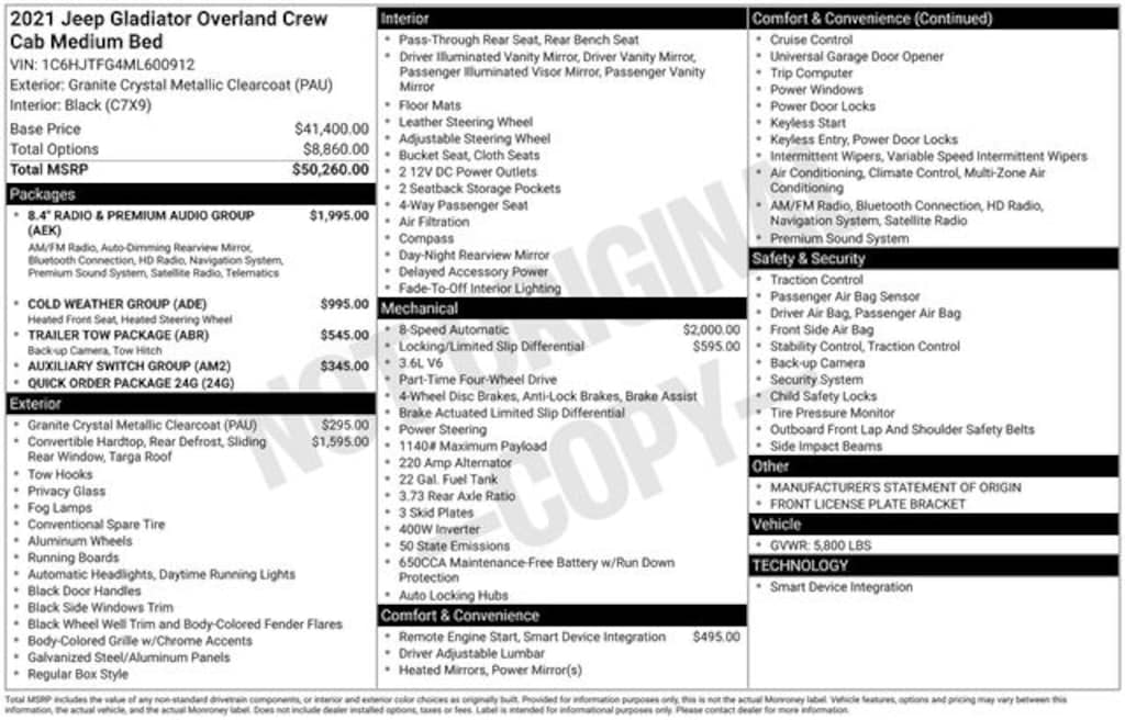 JEEP CERTIFIED!, LOCAL TRADE, 4WD, 3.6L V6, AUTOMATIC, BLACK HARD TOP, 24G PACKAGE, COLD WEATHER GROUP, 8.4" RADIO AND PREMIUM AUDIO GROUP, AUXILIARY SWITCH GROUP, TRAILER TOW PACKAGE, BLACK OVERLAND CLOTH BUCKET SEATS, HEATED SEATS, REMOTE START, REAR VIEW CAMERA, HEATED STEERING WHEEL, UCONNECT 4C NAVIGATION WITH 8.4" TOUCH SCREEN DISPLAY, ALPINE PREMIUM AUDIO SYSTEM, BLUETOOTH, SIRIUSXM, APPLE CARPLAY & GOOGLE ANDROID AUTO, CLASS IV TOW HITCH, ANTI SPIN REAR DIFFERENTIAL, 18" GRANITE CRYSTAL ALUMINUM WHEELS, FOLDING BED COVER, SIDE STEPS, 240 Amp Alternator, 3.73 Rear Axle Ratio, 4-Wheel Disc Brakes, 400W Inverter, 700 Amp Maintenance Free Battery, 8 Speakers, 8.4" Radio & Premium Audio Group, 8.4" Touchscreen Display, ABS brakes, Air Conditioning, Alpine Premium Audio System, AM/FM radio: SiriusXM, Anti-Spin Differential Rear Axle, Apple CarPlay/Android Auto, Auto-Dimming Rear-View Mirror, Automatic temperature control, Auxiliary Switch Group, Auxiliary Switches, Black 3-Piece Hard Top, Brake assist, Class IV Hitch Receiver, Cold Weather Group, Compass, Delay-off headlights, Driver door bin, Driver vanity mirror, Dual front impact airbags, Dual front side impact airbags, Electronic Stability Control, Emergency/Assistance Call, Freedom Panel Storage Bag, Front Center Armrest w/Storage, Front dual zone A/C, Front fog lights, Front reading lights, Fully automatic headlights, Garage door transmitter, GPS Navigation, HD Radio, Heated door mirrors, Heated Front Seats, Heated Steering Wheel, Heavy-Duty Engine Cooling, Illuminated entry, Integrated roll-over protection, Leather steering wheel, Low tire pressure warning, Normal Duty Plus Suspension, Occupant sensing airbag, Outside temperature display, Overland Cloth Bucket Seats, Panic alarm, ParkView Rear Back-Up Camera, Passenger door bin, Passenger vanity mirror, Power door mirrors, Power steering, Power windows, Premium Door Trim Panel, Quick Order Package 24G, Radio data system, Radio: Uconnect 4C Nav w/8.4" Display, Rear reading lights, Rear Sliding Window, Rear Window Defroster, Remote keyless entry, Remote Start System, Security system, SiriusXM Traffic Plus, SiriusXM Travel Link, Speed control, Split folding rear seat, Steering wheel mounted audio controls, Telescoping steering wheel, Tilt steering wheel, Traction control, Trailer Hitch Zoom, Trailer Tow Package, Variably intermittent wipers, Wheels: 18" x 7.5" Granite Crystal Aluminum.