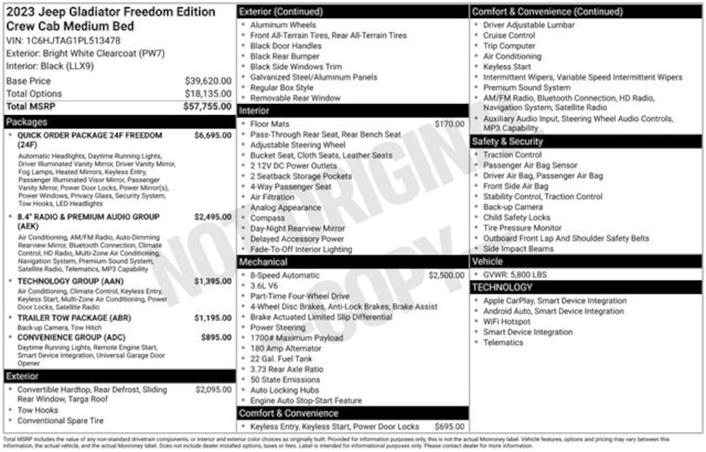 JEEP CERTIFIED!, ONE OWNER, CLEAN CARFAX, 4WD, 3.6L V6, AUTOMATIC, BLACK HARD TOP, 24F PACKAGE, FREEDOM EDITION PACKAGE, TECHNOLOGY GROUP, TRAILER TOW PACKAGE, CONVENIENCE GROUP, 8.4" RADIO AND PREMIUM AUDIO GROUP, UCONNECT 4C NAVIGATION WITH 8.4" TOUCH SCREEN DISPLAY, ALPINE PREMIUM AUDIO SYSTEM, BLUETOOTH, SIRIUSXM, APPLE CARPLAY & GOOGLE ANDROID AUTO, BLACK LEATHER TRIMMED CLOTH BUCKET SEATS, REAR VIEW CAMERA, STEEL REAR BUMPER, 17" GLOSS BLACK ALUMINUM WHEELS, LED HEADLAMPS, REMOTE START, ALPINE PREMIUM AUDIO SYSTEM, FRONT DOOR PASSIVE ENTRY AND LOCK, CLASS IV TOW HITCH, 110 mph Vehicle Max Speed Calibration, 115V Auxiliary Power Outlet, 2 Front & 2 Rear Tow Hooks, 3.73 Rear Axle Ratio, 4-Wheel Disc Brakes, 400W Inverter, 4G LTE Wi-Fi Hot Spot, 8 Speakers, 8.4" Radio & Premium Audio Group, 8.4" Touchscreen Display, ABS brakes, Air Conditioning w/Auto Temperature Control, Alpine Premium Audio System, AM/FM radio, American Flag Decals, Apple CarPlay/Android Auto, Auto-Dimming Rear-View Mirror, Automatic Headlamps, Black 3-Piece Hard Top, Body Color Fender Flares (2-Piece), Body Color Grille w/Gloss Black Rings, Brake assist, Class IV Receiver Hitch, Cluster 7.0" TFT Color Display, Compass, Console Bin Task Light, Convenience Group, Daytime Running Lamp System, Daytime Running Lamps LED Accents, Deep Tint Sunscreen Windows, Delay-off headlights, Driver door bin, Driver vanity mirror, Dual front impact airbags, Dual front side impact airbags, Electronic Stability Control, Emergency communication system, Emergency/Assistance Call, Freedom Edition Interior Accents, Freedom Edition Package, Freedom Package Decals, Freedom Panel Storage Bag, Front 1-Touch Down Power Windows, Front Bucket Seats, Front Center Armrest w/Storage, Front Door Locks 2-Door Passive Entry, Front fog lights, Front LED Fog Lamps, Front reading lights, Gladiator Fender Decal, Google Android Auto, GPS Antenna Input, GPS Navigation, HD Radio, Heavy-Duty Engine Cooling, Integrated Center Stack Radio, Integrated roll-over protection, Integrated Voice Command w/Bluetooth, Leather Trimmed Cloth Bucket Seats (DISC), LED Headlamp & Fog Lamp Group, LED Premium Reflector Headlamps, Low tire pressure warning, Media Hub w/2 Charge Only USBs, Normal Duty Plus Suspension, Normal Duty Suspension, Occupant sensing airbag, Off-Road Info Pages, Oscar Mike Badge, Outside temperature display, ParkView Rear Back-Up Camera, Passenger door bin, Passenger vanity mirror, Power Heated Mirrors, Power steering, Power Tailgate Lock, Premium Wrapped Steering Wheel, Quick Order Package 24F Freedom (DISC), Radio data system, Radio: Uconnect 4C Nav w/8.4" Display, Rear Armrest w/Cupholder Seat, Rear reading lights, Rear Sliding Window, Rear Window Defroster, Remote Keyless Entry, Rock Protection Sill Rails, Security Alarm, SiriusXM Radio Service, SiriusXM Satellite Radio, SiriusXM Traffic Plus, SiriusXM Travel Link, Speed control, Speed Sensitive Power Locks, Split folding rear seat, Steel Front Bumper, Steel Rear Bumper, Steering wheel mounted audio controls, Sun Visors w/Illuminated Vanity Mirrors, Technology Group, Telescoping steering wheel, Tilt steering wheel, Traction control, Trailer Hitch Zoom, Trailer Tow Package, Universal Garage Door Opener, USB Host Flip, Variably intermittent wipers, Wheels: 17" x 7.5" Gloss Black Aluminum.