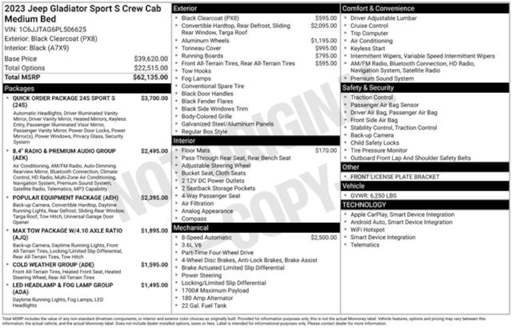 JEEP CERTIFIED!, CLEAN CARFAX, 4WD, 3.6L V6, AUTOMATIC, BLACK HARD TOP, 24S PACKAGE, LED HEADLAMP AND FOG LAMP GROUP, COLD WEATHER GROUP, POPULAR EQUIPMENT PACKAGE, 8.4" RADIO AND PREMIUM AUDIO GROUP, MAX TOW PACKAGE WITH 4.10 AXLE RATIO, UCONNECT 4C NAVIGIATON WITH 8.4" TOUCH SCREEN DISPLAY, BLUETOOTH, SIRIUSXM, APPLE CARPLAY & GOOGLE ANDROID AUTO, ALPINE PREMIUM AUDIO SYSTEM, BLACK CLOTH BUCKET SEATS, HEATED SEATS, HEATED STEERING WHEEL, REMOTE START, REAR VIEW CAMERA, CLASS IV TOW HITCH, 17" GLOSS BLACK ALUMINUM WHEELS, SIDE STEPS, BED LINER, ROLL UP BED COVERCLEAN CARFAX, 4WD, 3.6L V6, AUTOMATIC, BLACK HARD TOP, 24S PACKAGE, LED HEADLAMP AND FOG LAMP GROUP, COLD WEATHER GROUP, POPULAR EQUIPMENT PACKAGE, 8.4" RADIO AND PREMIUM AUDIO GROUP, MAX TOW PACKAGE WITH 4.10 AXLE RATIO, UCONNECT 4C NAVIGIATON WITH 8.4" TOUCH SCREEN DISPLAY, BLUETOOTH, SIRIUSXM, APPLE CARPLAY & GOOGLE ANDROID AUTO, ALPINE PREMIUM AUDIO SYSTEM, BLACK CLOTH BUCKET SEATS, HEATED SEATS, HEATED STEERING WHEEL, REMOTE START, REAR VIEW CAMERA, CLASS IV TOW HITCH, 17" GLOSS BLACK ALUMINUM WHEELS, SIDE STEPS, BED LINER, ROLL UP BED COVER, 4-Wheel Disc Brakes, 4.10 Rear Axle Ratio, 400W Inverter, 4G LTE Wi-Fi Hot Spot, 8 Speakers, 8.4" Radio & Premium Audio Group, 8.4" Touchscreen Display, ABS brakes, Air Conditioning w/Auto Temperature Control, Alpine Premium Audio System, Anti-Spin Differential Rear Axle, Apple CarPlay/Android Auto, Auto-Dimming Rear-View Mirror, Automatic Headlamps, Black 3-Piece Hard Top, Brake assist, Class IV Receiver Hitch, Cloth Low-Back Bucket Seats, Cold Weather Group, Compass, Console Bin Task Light, Convenience Group, Dana M210 Wide Front Axle, Dana M220 Wide Rear Axle, Daytime Running Lamp System, Daytime Running Lamps LED Accents, Deep Tint Sunscreen Windows, Delay-off headlights, Driver door bin, Driver vanity mirror, Dual front impact airbags, Dual front side impact airbags, Electronic Stability Control, Emergency communication system, Emergency/Assistance Call, Freedom Panel Storage Bag, Front 1-Touch Down Power Windows, Front Center Armrest w/Storage, Front fog lights, Front LED Fog Lamps, Front reading lights, Google Android Auto, GPS Navigation, HD Radio, Heated Front Seats, Heated Steering Wheel, Heavy-Duty Engine Cooling, Integrated Center Stack Radio, Integrated roll-over protection, Integrated Voice Command w/Bluetooth, LED Headlamp & Fog Lamp Group, LED Premium Reflector Headlamps, Low tire pressure warning, Max Tow Package w/4.10 Axle Ratio, Media Hub w/2 Charge Only USBs, Normal Duty Plus Suspension, Normal Duty Suspension, Occupant sensing airbag, Off-Road Info Pages, Outside temperature display, ParkView Rear Back-Up Camera, Passenger door bin, Passenger vanity mirror, Popular Equipment Package, Power Heated Mirrors, Power steering, Power Tailgate Lock, Premium Wrapped Steering Wheel, Quick Order Package 24S Sport S, Radio data system, Radio: Uconnect 4C Nav w/8.4" Display, Rear reading lights, Rear Sliding Window, Rear Window Defroster, Remote Keyless Entry, Security Alarm, Side Steps, SiriusXM Radio Service, SiriusXM Satellite Radio, SiriusXM Traffic Plus, SiriusXM Travel Link, Speed control, Speed Sensitive Power Locks, Split folding rear seat, Sport S, Steering wheel mounted audio controls, Sun Visors w/Illuminated Vanity Mirrors, Telescoping steering wheel, Tilt steering wheel, Traction control, Trailer Hitch Zoom, Trailer Tow Package, Universal Garage Door Opener, USB Host Flip, Variably intermittent wipers, Wheels: 17" x 7.5" Gloss Black Aluminum.