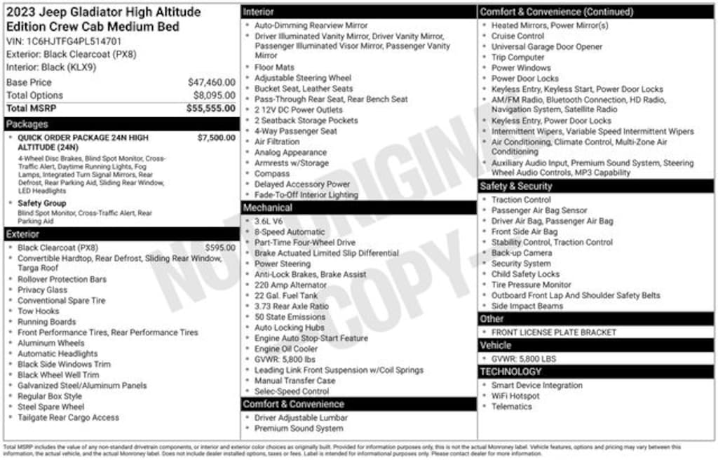 JEEP CERTIFIED!, ONE OWNER, 4WD, 3.6L V6, AUTOMATIC, BODY COLOR HARD TOP, 24N PACKAGE, HIGH ALTITUDE PACKAGE, PREMIUM LED LIGHTING GROUP, JEEP ACTIVE SAFETY GROUP, BLACK NAPPA LEATHER SEATS, REAR PARK ASSIST, BLIND SPOT AND CROSS PATH DETECTION, REAR VIEW CAMERA, UCONNECT 4C NAVIGATION WITH 8.4" TOUCH SCREEN DISPLAY, BLUETOOTH, SIRIUSXM, APPLE CARPLAY & GOOGLE ANDROID AUTO, ALPINE PREMIUM AUDIO SYSTEM, 20" GLOSS BLACK ALUMINUM WHEELS, SIDE STEPS, BED LINER, 3.73 Rear Axle Ratio, 9 Speakers, ABS 4-Wheel HD Disc Brakes w/CI Knuckle, ABS brakes, Air Conditioning, AM/FM radio: SiriusXM, Apple CarPlay/Android Auto, Auto-dimming Rear-View mirror, Automatic temperature control, Blind Spot & Cross Path Detection, Body Color 3-Piece Hard Top, Body Color Front Bumper, Body Color Grille w/Gloss Black Rings, Body Color Rear Bumper w/Step Pads, Body-Color Door & Tailgate Handles, Brake assist, Caramel Interior Accents, Compass, Dana M210 Wide Front Axle, Dana M220 Wide Rear Axle, Daytime Running Lamps LED Accents, Delay-off headlights, Driver door bin, Driver vanity mirror, Dual front impact airbags, Dual front side impact airbags, Electronic Stability Control, Emergency communication system, Exterior Mirrors w/Supplemental Signals, Freedom Panel Storage Bag, Front Bucket Seats, Front Center Armrest w/Storage, Front dual zone A/C, Front fog lights, Front LED Fog Lamps, Front reading lights, Full Body Color Fender Flares, Full Length Floor Console Premium Armrest, Fully automatic headlights, Garage door transmitter, Gloss Black Limited Badge, Gray/Black Trail Rated Badge, Heated door mirrors, High Altitude Package, Illuminated entry, Integrated roll-over protection, Leather Wrapped Park Brake Handle, Leather Wrapped Shift Knob, LED Lighting Group, LED Park Turn Lamps, LED Premium Reflector Headlamps, LED Taillamps, Low tire pressure warning, Nappa Leather Seats, Navigation System, No Soft Top, Normal Duty Plus Suspension (DISC), Occupant sensing airbag, Outside temperature display, Panic alarm, ParkSense Rear Park Assist System, ParkView Rear Back-Up Camera, Passenger door bin, Passenger vanity mirror, Power door mirrors, Power steering, Power windows, Premium Dark Exterior Accents, Quick Order Package 24N High Altitude, Radio data system, Radio: Uconnect 4C Nav w/8.4" Display, Rear Armrest w/Cupholder Seat, Rear reading lights, Rear Sliding Window, Rear Window Defroster, Remote keyless entry, Safety Group, Security system, Selec-Speed Control, Side Steps, Speed control, Split folding rear seat, Sport Front Shock Absorbers, Sport Rear Shock Absorbers, Sport Suspension, Steering wheel mounted audio controls, Telescoping steering wheel, Tilt steering wheel, Traction control, Variably intermittent wipers, Wheels: 20" x 8" Gloss Black Aluminum, Wrapped I/P Bezel w/Caramel Stitch.