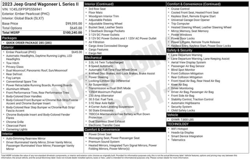 JEEP CERTIFIED!, ONE OWNER, CLEAN CARFAX, 4WD, 3.0L I6 HURRICANE TWIN TURBO, AUTOMATIC, 28S PACKAGE, BLACK ROOF, TRI PANE PANORAMIC SUNROOF, UCONNECT 5 NAVIGATION WITH 12" TOUCH SCREEN DISPLAY, GLOBAL BLACK PALERMO LEATHER, HEATED/COOLED SEATS, POWER SEATS, HEATED 2ND ROW SEATS, 2ND ROW CAPTAINS CHAIRS, 3RD ROW SEAT, HEATED STEERING WHEEL, QUADRA LIFT AIR SUSPENSION, HEAD UP DISPLAY, DROWSY DRIVER DETECTION, DIGITAL REAR VIEW MIRROR, 360 SURROUND VIEW CAMERA, PARKSENSE AUTOMATED PARKING SYSTEM, REMOTE START, ADAPTIVE CRUISE CONTROL, ACTIVE LANE MANAGEMENT SYSTEM, FULL SPEED FORWARD COLLISION WARNING PLUS, BLIND SPOT AND REAR CROSS PATH DETECTION, BLUETOOTH, SIRIUSXM, APPLE CARPLAY & GOOGLE ANDROID AUTO, MCINTOSH MX950 ENTERTAINMENT SYSTEM WITH 19 SPEAKERS, WIRELESS CHARGING PAD, POWER DEPLOYABLE RUNNING BOARDS, HANDS FREE POWER LIFTGATE, 22" POLISHED ALUMINUM WHEELS WITH LUSTER GRAY POCKETS, 3.92 Rear Axle Ratio, 3rd row seats: bench, 4-Wheel Disc Brakes, ABS brakes, Adjustable pedals, Air Conditioning, AM/FM radio: SiriusXM with 360L, Anti-whiplash front head restraints, Auto High-beam Headlights, Auto-dimming door mirrors, Auto-dimming Rear-View mirror, Auto-leveling suspension, Automatic temperature control, Brake assist, Bumpers: body-color, Compass, Delay-off headlights, Driver door bin, Driver vanity mirror, Driver's Seat Mounted Armrest, Dual front impact airbags, Dual front side impact airbags, Electronic Stability Control, Emergency communication system: Automatic SOS Call, Four wheel independent suspension, Front Bucket Seats, Front Center Armrest w/Storage, Front dual zone A/C, Front fog lights, Front reading lights, Fully automatic headlights, Garage door transmitter, Genuine wood console insert, Genuine wood dashboard insert, Genuine wood door panel insert, Heads-Up Display, Heated door mirrors, Heated front seats, Heated rear seats, Heated steering wheel, Illuminated entry, Knee airbag, Leather steering wheel, Leather Trimmed Bucket Seats, Low tire pressure warning, Memory seat, Navigation System, Normal Duty Suspension, Occupant sensing airbag, Outside temperature display, Overhead airbag, Overhead console, Panic alarm, Passenger door bin, Passenger seat mounted armrest, Passenger vanity mirror, Pedal memory, Power adjustable front head restraints, Power door mirrors, Power driver seat, Power Liftgate, Power moonroof, Power passenger seat, Power steering, Power windows, Quick Order Package 28S, Radio data system, Radio: Uconnect 5 Nav w/12.0" Display, Rain sensing wipers, Rear air conditioning, Rear dual zone A/C, Rear reading lights, Rear seat center armrest, Rear window defroster, Rear window wiper, Reclining 3rd row seat, Remote keyless entry, Security system, Speed control, Speed-sensing steering, Split folding rear seat, Steering wheel memory, Steering wheel mounted audio controls, Telescoping steering wheel, Tilt steering wheel, Traction control, Turn signal indicator mirrors, Two Tone Paint Group, Ventilated front seats, Wheels: 22" x 9.0" Premium 1 Aluminum.
