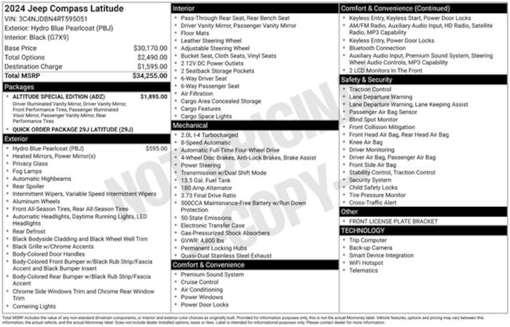 JEEP CERTIFIED!, ONE OWNER, 4WD, 2.0L TURBO, AUTOMATIC, 29J PACKAGE, BLACK PREMIUM CLOTH/VINYL BUCKET SEATS, FULL SPEED FORWARD COLLISION WARNING PLUS, BLIND SPOT AND CROSS PATH DETECTION, ACTIVE LANE MANAGEMENT SYSTEM, DROWSY DRIVER DETECTION, REAR VIEW CAMERA, UCONNECT 5 WITH 10.1" TOUCH SCREEN DISPLAY, BLUETOOTH, SIRIUSXM, APPLE CARPLAY & GOOGLE ANDROID AUTO, 6 SPEAKERS, 3.73 Final Drive Ratio, 4-Wheel Disc Brakes, 6 Speakers, ABS brakes, Air Conditioning, AM/FM radio: SiriusXM, Auto High-beam Headlights, Brake assist, Bumpers: body-color, Compass, Delay-off headlights, Driver door bin, Driver vanity mirror, Dual front impact airbags, Dual front side impact airbags, Electronic Stability Control, Emergency communication system: Jeep Connect, Four wheel independent suspension, Front Bucket Seats, Front Center Armrest w/Storage, Front fog lights, Front reading lights, Fully automatic headlights, Heated door mirrors, Illuminated entry, Knee airbag, Leather Shift Knob, Leather steering wheel, Low tire pressure warning, Occupant sensing airbag, Outside temperature display, Overhead airbag, Overhead console, Panic alarm, ParkView Rear Back-Up Camera, Passenger door bin, Passenger vanity mirror, Power door mirrors, Power steering, Power windows, Premium Cloth/Vinyl Bucket Seats, Quick Order Package 29J Latitude, Radio: Uconnect 5 w/10.1" Display, Rear seat center armrest, Rear window defroster, Rear window wiper, Remote keyless entry, Security system, Speed control, Split folding rear seat, Spoiler, Steering wheel mounted audio controls, Telescoping steering wheel, Tilt steering wheel, Traction control, Variably intermittent wipers. 24/32 City/Highway MPG