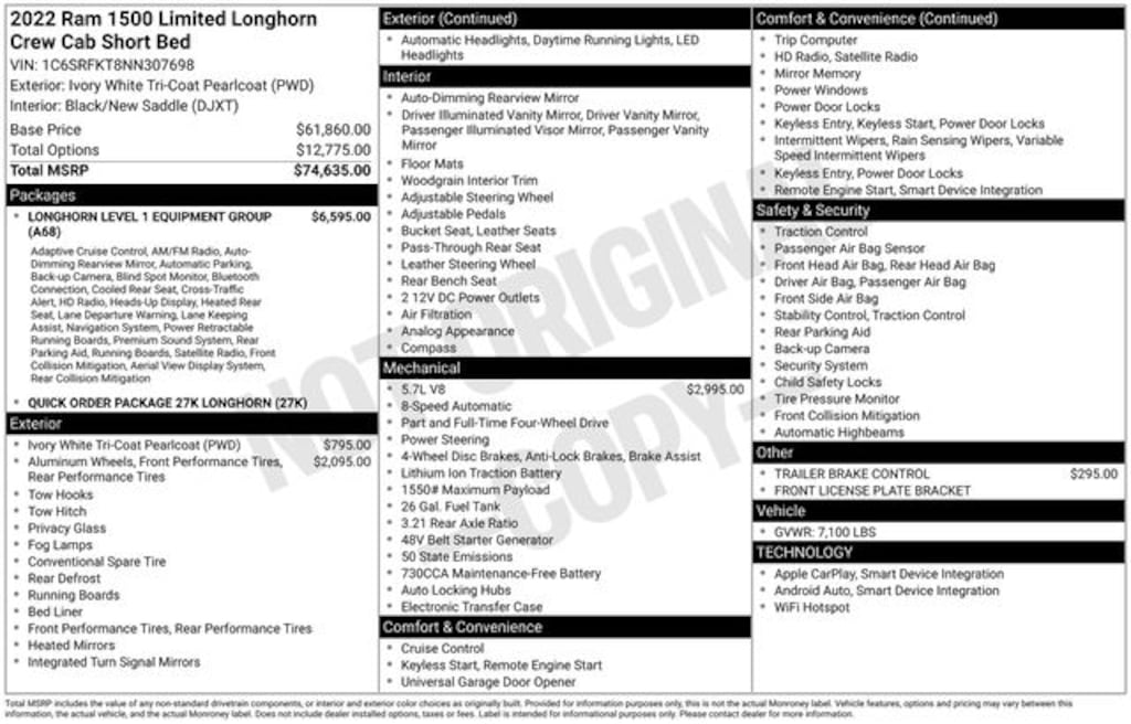 ONE OWNER, LOCAL TRADE, CLEAN CARFAX, 4WD, HEMI 5.7L V8 WITH ETORQUE, AUTOMATIC, 27K PACKAGE, LOWER TWO TONE PAINT, UCONNECT 5 NAVIGATION WITH 8.4" TOUCH SCREEN DISPLAY, NEW SADDLE LEATHER BUCKET SEATS, HEATED/COOLED SEATS, POWER SEATS, HEATED REAR SEATS, HEATED STEERING WHEEL, REAR VIEW CAMERA, REMOTE START, BLUETOOTH, SIRIUSXM, APPLE CARPLAY & GOOGLE ANDROID AUTO, 9 AMPLIFIED SPEAKERS WITH SUBWOOFER, REAR POWER SLIDING WINDOW, FULL SPEED FORWARD COLLISION WARNING PLUS, POWER TAILGATE RELEASE, FRONT/REAR PARK ASSIST, CLASS IV TOW HITCH, TRAILER BRAKE CONTROLLER, SPRAY IN BEDLINER BY MOPAR, 22" WHEELS, #1 Seat Foam Cushion, 10 Speakers, 3 Rear Seat Head Restraints, 3.21 Rear Axle Ratio, 4 Way Front Headrests, 4-Wheel Disc Brakes, 48V Belt Starter Generator, 4G LTE Wi-Fi Hot Spot, ABS brakes, Adjustable pedals, Air Conditioning, AM/FM radio: SiriusXM, Apple CarPlay/Android Auto, Auto High-beam Headlights, Auto-dimming door mirrors, Auto-dimming Rear-View mirror, Automatic temperature control, Brake assist, Bumpers: chrome, Chrome Exterior Mirrors, Compass, Connected Travel & Traffic Services, Connectivity - US/Canada, Delay-off headlights, Disassociated Touchscreen Display, Driver door bin, Driver Seat Memory, Driver vanity mirror, Dual front impact airbags, Dual front side impact airbags, Electronic Stability Control, Exterior Mirrors Courtesy Lamps, Exterior Mirrors w/Heating Element, Exterior Mirrors w/Memory, Exterior Mirrors w/Supplemental Signals, Front Bucket Seats, Front Center Armrest w/Storage, Front dual zone A/C, Front fog lights, Front reading lights, Front Seat Back Map Pockets, Front wheel independent suspension, Full Length Premium Floor Console, Fully automatic headlights, Garage door transmitter, Genuine wood console insert, Genuine wood dashboard insert, Genuine wood door panel insert, Global Telematics Box Module (TBM), Google Android Auto, GPS Navigation, HD Radio, Heated door mirrors, Heated Front Seats, Heated rear seats, Heated Second Row Seats, Heated Steering Wheel, Heavy-Duty Engine Cooling, Illuminated entry, Integrated Center Stack Radio, Integrated Voice Command w/Bluetooth, Leather steering wheel, Leather Trimmed Bucket Seats, Low tire pressure warning, Memory seat, Navigation System, Occupant sensing airbag, Outside temperature display, Overhead airbag, Overhead console, Panic alarm, ParkView Rear Back-Up Camera, Passenger door bin, Passenger vanity mirror, Pedal memory, Power 4-Way Driver Lumbar Adjust, Power 4-Way Passenger Lumbar Adjust, Power 8-Way Driver & Passenger Seats, Power door mirrors, Power driver seat, Power steering, Power windows, Power-Folding Mirrors, Quick Order Package 27K Longhorn, Radio data system, Radio: Uconnect 5 Nav w/8.4" Display, Rain sensing wipers, Rear 60/40 Folding Split Recline Seat, Rear seat center armrest, Rear step bumper, Rear window defroster, Remote keyless entry, Security system, SiriusXM Radio Service, SiriusXM w/360L, Speed control, Split folding rear seat, Steering wheel mounted audio controls, Telescoping steering wheel, Tilt steering wheel, Traction control, Trailer Brake Control, Turn signal indicator mirrors, USB Host Flip, Ventilated Front Seats, Wheels: 22" x 9" Aluminum Painted/Polished. Odometer is 10206 miles below market average!