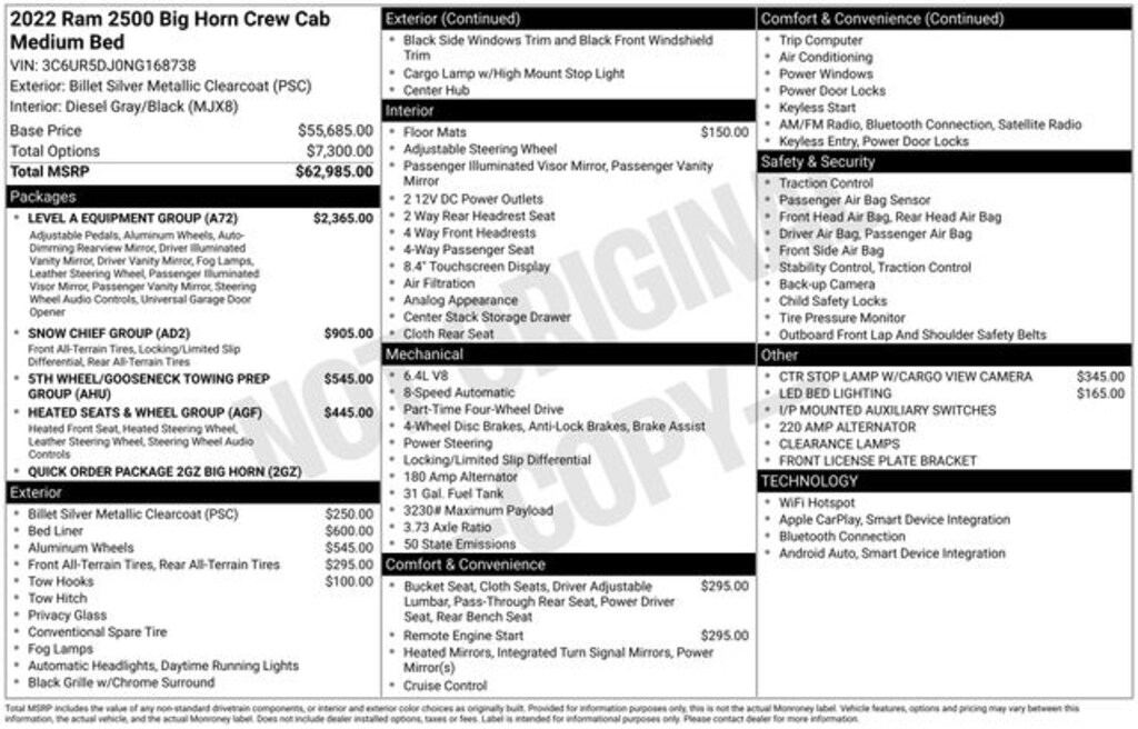 RAM CERTIFIED!, ONE OWNER, LOCAL TRADE, CLEAN CARFAX, 4WD, 6.4L V8 HEAVY DUTY HEMI, AUTOMATIC, 2GZ PACKAGE, LEVEL A EQUIPMENT GROUP, SNOW CHIEF GROUP, HEATED SEATS AND WHEEL GROUP, 5TH WHEEL/ GOOSENECK TOWING PREP GROUP, REMOTE START, PREMIUM CLOTH BUCKET SEATS, HEATED SEATS, POWER SEAT, HEATED STEERING WHEEL, REAR VIEW CAMERA, REMOTE KEYLESS ENTRY, UCONNECT 5 WITH 8.4" TOUCH SCREEN DISPLAY, BLUETOOTH, SIRIUSXM, APPLE CARPLAY & GOOGLE ANDROID AUTO, ANTI SPIN DIFFERENTIAL REAR AXLE, CLEARANCE LAMPS, FRONT FOG LAMPS, CENTER STOP LAMP WITH CARGO VIEW CAMERA, LED BED LIGHTING, TOW HOOKS, SPRAY IN BEDLINER, CLASS V TOW HITCH, 18" POLISHED ALUMINUM WHEELS, 220 Amp Alternator, 2nd Row In Floor Storage Bins, 3.73 Axle Ratio, 4 Way Front Headrests, 4-Wheel Disc Brakes, 4G LTE Wi-Fi Hot Spot, 5th Wheel/Gooseneck Towing Prep Group, 6 Speakers, 8.4" Touchscreen Display, ABS brakes, Active Noise Control System, Air Conditioning, AM/FM radio: SiriusXM, Anti-Spin Differential Rear Axle, Apple CarPlay, Apple CarPlay/Android Auto, Auto-Dimming Rear-View Mirror, Bluetooth Handsfree Phone & Audio, Brake assist, Bucket Seats, Bumpers: chrome, Clearance Lamps, Compass, Connectivity - US/Canada, CTR Stop Lamp w/Cargo View Camera, Dash Pass Thru Wire Circuits, Delay-off headlights, Driver door bin, Dual front impact airbags, Dual front side impact airbags, Dual Glove Boxes, Electronic Stability Control, Electronically Controlled Throttle, Foam Bottle Insert (Door Trim Panel), Folding Flat Load Floor Storage, Footwell Courtesy Lamp, Front Center Armrest w/Storage, Front Fog Lamps, Front reading lights, Front Seat Back Map Pockets, Full Length Upgraded Floor Console, Fully automatic headlights, Global Telematics Box Module (TBM), Glove Box Lamp, Google Android Auto, GPS Antenna Input, Heated door mirrors, Heated Front Seats, Heated Seats & Wheel Group, Heated Steering Wheel, I/P Mounted Auxiliary Switches, Illuminated entry, Integrated Center Stack Radio, Integrated Voice Command w/Bluetooth, Leather Wrapped Steering Wheel, LED Bed Lighting, Level A Equipment Group, Locking Lower Glove Box, Low tire pressure warning, Manual Adjust 4-Way Driver Seat, Manual Adjust 4-Way Front Passenger Seat, MOPAR Spray In Bedliner, Occupant sensing airbag, Outside temperature display, Overhead airbag, Overhead console, Panic alarm, ParkView Rear Back-Up Camera, Passenger door bin, Passenger vanity mirror, Power 2-Way Driver Lumbar Adjust, Power Adjust 8-Way Driver Seat, Power Adjustable Pedals, Power door mirrors, Power steering, Power windows, Premium Cloth Bucket Seats (DISC), Quick Order Package 2GZ Big Horn, Radio data system, Radio: Uconnect 5 W w/8.4" Display, Rear 60/40 Folding Seat, Rear Dome w/On/Off Switch Lamp, Rear Folding Seat, Rear seat center armrest, Rear step bumper, Remote keyless entry, Remote Start System, Selectable Tire Fill Alert, SiriusXM Satellite Radio, Snow Chief Group, Speed control, Steering Wheel Mounted Audio Controls, Sun Visors w/Illuminated Vanity Mirrors, Tilt steering wheel, Tip Start, Tow Hooks, Traction control, Turn signal indicator mirrors, Universal Garage Door Opener, Variably intermittent wipers, Vendor Painted Cargo Box, Vendor Painted Cargo Box Tracking, Wheels: 18" x 8.0" Polished Aluminum. Odometer is 35824 miles below market average!