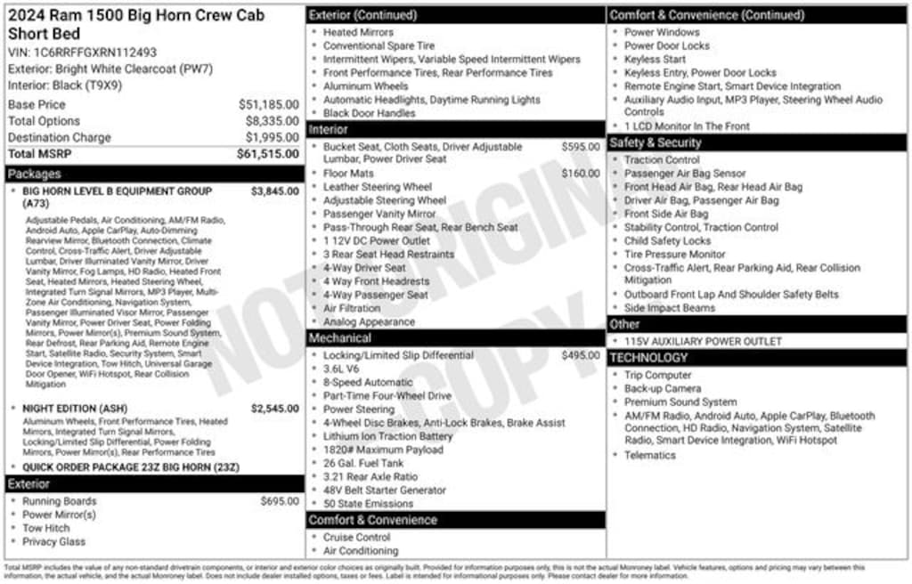 RAM CERTIFIED!, ONE OWNER, LOCAL TRADE, CLEAN CARFAX, 4WD, 3.6L V6 ETORQUE, AUTOMATIC, 23Z PACKAGE, NIGHT EDITION, BIG HORN LEVEL B EQUIPMENT GROUP, UCONNECT 5 NAVIGATION WITH 12" TOUCH SCREEN DISPLAY, 9 AMPLIFIED SPEAKERS WITH SUBWOOFER, BLUETOOTH, SIRIUSXM, APPLE CARPLAY & GOOGLE ANDROID AUTO, BLACK DELUXE CLOTH BUCKET SEATS, HEATED SEATS, POWER SEAT, REMOTE START, REAR VIEW CAMERA, HEATED STEERING WHEEL, FRONT/REAR PARK ASSIST, REAR POWER SLIDING WINDOW, ANTI SPIN DIFFERENTIAL REAR AXLE, BLACK TUBULAR SIDE STEPS BY MOPAR, SPRAY IN BEDLINER, CLASS IV TOW HITCH, 20" WHEELS, 2nd Row In Floor Storage Bins, 3 Rear Seat Head Restraints, 3.21 Rear Axle Ratio, 4 Way Front Headrests, 4-Wheel Disc Brakes, 400W Inverter, 48V Belt Starter Generator, 4G LTE Wi-Fi Hot Spot, 9 Amplified Speakers w/Subwoofer, ABS brakes, Accent Color Door Handles, Accent Color Premium Power Mirrors, Air Conditioning ATC w/Dual Zone Control, All R1 High Radios, All Radio Equipped Vehicles, AM/FM radio, Anti-Spin Differential Rear Axle, Apple CarPlay, Auto-Dimming Exterior Driver Mirror, Auto-Dimming Rear-View Mirror, Big Horn Badge, Big Horn Level B Equipment Group, Black Exterior Truck Badging, Black Headlamp Bezels, Black Interior Accents, Black Painted Exterior Mirrors Caps, Black Premium Power Mirrors, Body Color Front Bumper, Body Color Rear Bumper w/Step Pads, Brake assist, Bucket Seats, Class IV Receiver Hitch, Cluster 7.0" TFT Color Display, Compass, Connected Travel & Traffic Services, Connectivity - US/Canada, Convex Wide-Angle Exterior Mirror Insert, Delay-off headlights, Deluxe Cloth Bucket Seats, Driver door bin, Dual Exhaust w/Black Tips, Dual front impact airbags, Dual front side impact airbags, Electronic Stability Control, Emergency communication system: RAM Connect, Exterior Mirrors Courtesy Lamps, Exterior Mirrors w/Heating Element, Exterior Mirrors w/Supplemental Signals, Front Center Armrest w/Storage, Front Fog Lamps, Front reading lights, Front Seat Back Map Pockets, Front wheel independent suspension, Full Length Floor Console, Fully automatic headlights, Global Telematics Box Module (TBM), Glove Box Lamp, Google Android Auto, GPS Navigation, Grille Surround 1 Black Texture 2 Black, HD Radio, Heated door mirrors, Heated Front Seats, Heated Steering Wheel, Illuminated entry, Integrated Voice Command w/Bluetooth, Leather steering wheel, LED Footwell Lighting, Low tire pressure warning, Manual Adjust 4-Way Front Passenger Seat, Media Hub w/2 Charge Only USBs, Mopar Black Tubular Side Steps, MOPAR Front & Rear Rubber Floor Mats, Night Edition, Occupant sensing airbag, Outside temperature display, Overhead airbag, Overhead console, Panic alarm, ParkSense Front/Rear Park Assist w/Stop, ParkView Rear Back-Up Camera, Passenger door bin, Passenger vanity mirror, Power 2-Way Driver Lumbar Adjust, Power 8-Way Driver Seat, Power Adjustable Pedals, Power door mirrors, Power steering, Power windows, Power-Folding Mirrors, Quick Order Package 23Z Big Horn, Radio data system, Radio: Uconnect 5 Nav w/12.0" Display, RAM Grille Badge - Black, Rear 60/40 Folding Seat, Rear Center Armrest, Rear Dome w/On/Off Switch Lamp, Rear Power Sliding Window, Rear seat center armrest, Rear step bumper, Rear Window Defroster, Remote keyless entry, Remote Start System, Security Alarm, SiriusXM Radio Service, SiriusXM Satellite Radio, SiriusXM w/360L, Speed control, Split folding rear seat, Steering wheel mounted audio controls, Sun Visors w/Illuminated Vanity Mirrors, Telescoping steering wheel, Tilt steering wheel, Traction control, Universal Garage Door Opener, USB Host Flip, Variably intermittent wipers, Wheels: 20" x 9.0" Premium Paint/Polished.