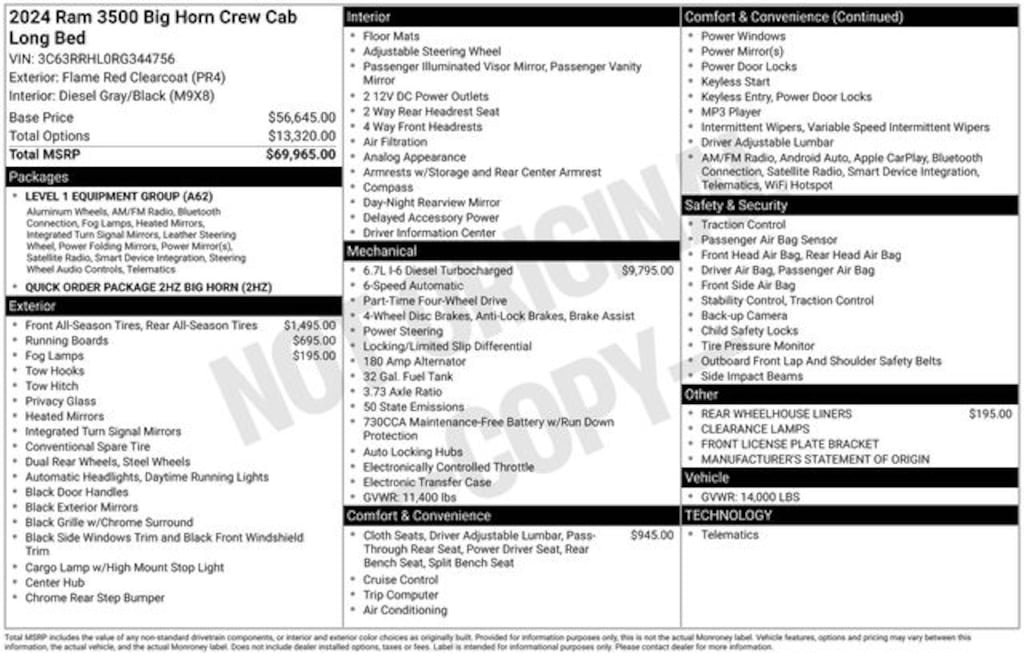 ONE OWNER, CLEAN CARFAX, 4WD, CUMMINS 6.7L TURBO DIESEL, AUTOMATIC, DUAL REAR WHEELS, LONG BOX, 2HZ PACKAGE, LEVEL 1 EQUIPMENT GROUP, PREMIUM CLOTH BENCH SEAT, POWER SEAT, UCONNECT 5 WITH 8.4" TOUCH SCREEN DISPLAY, BLUETOOTH, SIRIUSXM, APPLE CARPLAY & GOOGLE ANDROID AUTO, REAR VIEW CAMERA, AUTOMATIC POWER FOLDING MIRRORS, FRONT FOG LAMPS, CHROME FLAT CAB LENGTH SIDE STEPS, CLASS V TOW HITCH, TRAILER BRAKE CONTROLLER, 17" STEEL CHROME CLAD WHEELS, 2 Way Rear Headrest Seat, 2nd Row In Floor Storage Bins, 3.73 Axle Ratio, 4 Way Front Headrests, 4-Wheel Disc Brakes, 40/20/40 Split Bench Seat, 4G LTE Wi-Fi Hot Spot, 6 Speakers, 6000# Front Axle w/Hub Ext, 8.4" Touchscreen Display, ABS brakes, Active Noise Control System, Air Conditioning, All R1 Low Radios, All Radio Equipped Vehicles, Apple CarPlay, Auto Power-Folding Mirrors, Black Exterior Mirrors, Bluetooth Handsfree Phone & Audio, Box & Rear Fender Clearance Lamps, Bumpers: chrome, Center Hub, Chrome Flat Cab-Length Side Steps, Clearance Lamps, Compass, Connectivity - US/Canada, Driver door bin, Dual front impact airbags, Dual front side impact airbags, Dual Glove Boxes, Dual Rear Wheels, Electronically Controlled Throttle, Emergency communication system: SiriusXM Guardian, Exterior Mirrors Courtesy Lamps, Exterior Mirrors w/Heating Element, Exterior Mirrors w/Supplemental Signals, Foam Bottle Insert (Door Trim Panel), Footwell Courtesy Lamp, Forward & Reverse Utility Lights, Front Armrest w/Cupholders, Front Center Armrest w/Storage, Front Center Seat Cushion Storage, Front Fog Lamps, Front reading lights, Front Seat Back Map Pockets, Global Telematics Box Module (TBM), Glove Box Lamp, Google Android Auto, GPS Antenna Input, Heated door mirrors, Illuminated entry, Integrated Center Stack Radio, Integrated Voice Command w/Bluetooth, Leather Wrapped Steering Wheel, Level 1 Equipment Group, Locking Lower Glove Box, Low tire pressure warning, Manual Adjust 4-Way Front Passenger Seat, Mirror Running Lights, Occupant sensing airbag, Outside temperature display, Overhead airbag, Overhead console, Panic alarm, Passenger door bin, Passenger vanity mirror, Power Adjust 8-Way Driver Seat, Power Adjust Mirrors, Power Heated Fold Telescopic Mirrors, Power steering, Power Telescoping Mirrors, Power windows, Power-Adjustable Convex Aux Mirrors, Premium Cloth 40/20/40 Bench Seat, Quick Order Package 2HZ Big Horn, Radio data system, Radio: Uconnect 5 w/8.4" Display (DISC), Rear 60/40 Folding Seat, Rear Dome w/On/Off Switch Lamp, Rear seat center armrest, Rear step bumper, Rear Wheelhouse Liners, Remote keyless entry, Remote USB Port - Charge Only, Selectable Tire Fill Alert, SiriusXM Radio Service, SiriusXM Satellite Radio, Speed control, Steering Wheel Mounted Audio Controls, Storage Tray, Tilt steering wheel, Tip Start, Traction control, Turn signal indicator mirrors, Variably intermittent wipers, Wheels: 17" x 6.0" Steel Chrome Clad.
