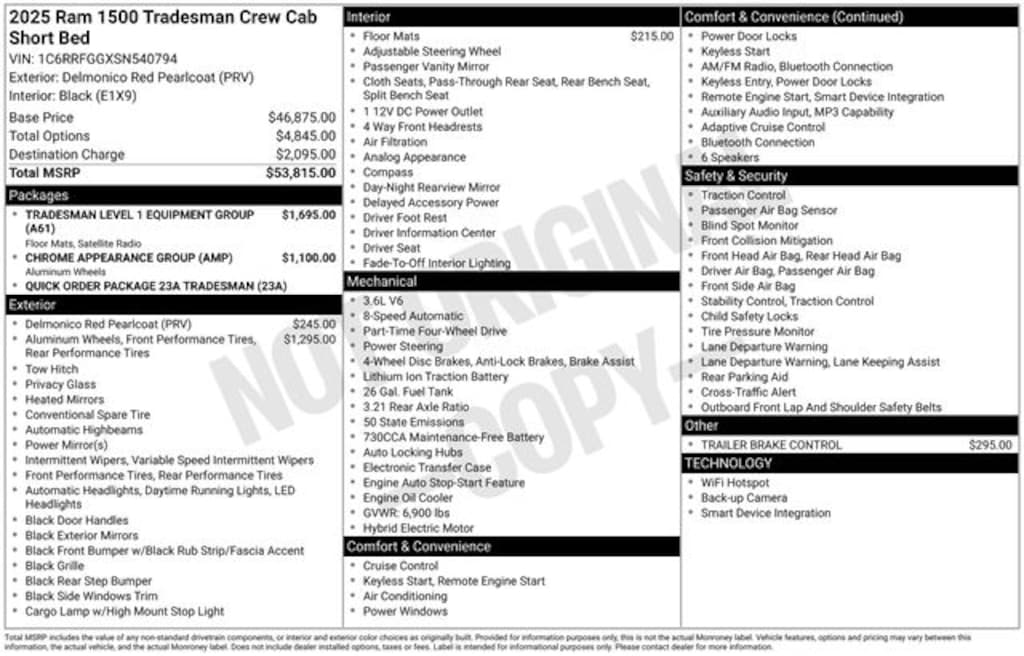 RAM CERTIFIED!, ONE OWNER, LOCAL TRADE, CLEAN CARFAX, 4WD, 3.6L V6 ETORQUE, AUTOMATIC, 23A PACKAGE, CHROME APPEARANCE GROUP, TRADESMAN LEVEL 1 EQUIPMENT GROUP, BLACK CLOTH BENCH SEAT, UCONNECT 5 WITH 8.4" TOUCH SCREEN DISPLAY, BLUETOOTH, SIRIUSXM, APPLE CARPLAY & GOOGLE ANDROID AUTO, 6 SPEAKERS, REMOTE START, REAR VIEW CAMERA, FULL SPEED FORWARD COLLISION WARNING PLUS, ADAPTIVE CRUISE CONTROL, BLIND SPOT AND CROSS PATH DETECTION, FRONT/REAR PARK ASSIST, ACTIVE LANE MANAGEMENT SYSTEM, REAR POWER SLIDING WINDOW, CLASS IV TOW HITCH, TRAILER BRAKE CONTROLLER, BED COVER, SPRAY IN BEDLINER, 20" ALUMINUM POLISHED PAINTED WHEELS, 26 GALLON FUEL TANK, 3 Rear Seat Head Restraints, 3.21 Rear Axle Ratio, 4 Way Front Headrests, 4-Wheel Disc Brakes, 40/20/40 Split Bench Seat, 6 Speakers, ABS brakes, Air Conditioning, AM/FM radio, Apple CarPlay/Android Auto, Auto High-beam Headlights, Black Exterior Mirrors, Brake assist, Bright Front Bumper, Bright Rear Bumper, Chrome Appearance Group, Chrome Headlamp Bezels, Cloth Bench Seat, Compass, Delay-off headlights, Driver door bin, Dual front impact airbags, Dual front side impact airbags, Electronic Stability Control, Exterior Mirrors w/Heating Element, Front & Rear Floor Mats, Front Center Armrest, Front Center Seat Cushion Storage, Front reading lights, Front Seat Back Map Pockets, Front wheel independent suspension, Fully automatic headlights, Grille Surround 1 Chrome Texture 1 Black, Heated door mirrors, Illuminated entry, Low tire pressure warning, Manual Adjust 4-Way Driver Seat, Manual Adjust 4-Way Front Passenger Seat, Manual Folding Exterior Mirrors, Occupant sensing airbag, Outside temperature display, Overhead airbag, Overhead console, Panic alarm, ParkView Rear Back-Up Camera, Passenger door bin, Passenger vanity mirror, Power door mirrors, Power steering, Power windows, Quick Order Package 23A Tradesman, Radio data system, Radio: Uconnect 5 W w/8.4" Display, RAM Grille Badge - Black, RAM Grille Badge - Chrome, Rear 60/40 Folding Seat, Rear Power Sliding Window, Rear step bumper, Remote keyless entry, Seat Parts Module II, SiriusXM Satellite Radio, Speed control, Telescoping steering wheel, Tilt steering wheel, Traction control, Tradesman Level 1 Equipment Group, Trailer Brake Control, Variably intermittent wipers, Wheels: 20" x 9.0" Aluminum Polished Painted.