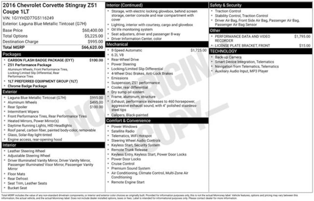 LOCAL TRADE, CLEAN CARFAX, REAR WHEEL DRIVE, 6.2L V8, AUTOMATIC, PAINTED BODY COLOR CARBON FIBER REMOVABLE ROOF PANEL, 1LT GROUP, CARBON FLASH BADGE PACKAGE, LEATHER, POWER SEAT, BLUETOOTH, SIRIUSXM, APPLE CARPLY & ANDROID AUTO, MYLINK WITH NAVIGATION, BOSE PREMIUM 9 SPEAKER AUDIO SYSTEM, REAR VIEW CAMERA, REMOTE START, REMOTE KEYLESS ENTRY, HID HEADLIGHTS, SPOILER, 19" BLACK ALUMINUM WHEELS, 2.73 Limited Slip Performance Rear Axle Ratio, 4-Wheel Disc Brakes, 8-Way Driver & Passenger Seat Adjusters, ABS brakes, Air Conditioning, AM/FM radio: SiriusXM, Apple CarPlay, Automatic temperature control, Bose Premium 9-Speaker Audio System Feature, Bumpers: body-color, Carbon Flash Badge Package, Carbon Flash-Painted Outside Mirrors, Carbon Flash-Painted Rear Spoiler, Compass, Delay-off headlights, Driver door bin, Driver vanity mirror, Dual front impact airbags, Dual front side impact airbags, Electronic Stability Control, Emergency communication system, Exterior Parking Camera Rear, Four wheel independent suspension, Front Bucket Seats, Front Center Armrest, Front dual zone A/C, Front reading lights, Fully automatic headlights, GT Bucket Seats, Heated door mirrors, High-Intensity Discharge Headlights, Illuminated entry, Leather Shift Knob, Leather steering wheel, Low tire pressure warning, Occupant sensing airbag, Outside temperature display, Painted Body-Color Carbon Fiber Removable Roof Panel, Panic alarm, Passenger door bin, Passenger vanity mirror, Performance Data & Video Recorder, Power door mirrors, Power driver seat, Power passenger seat, Power steering, Power windows, Preferred Equipment Group 1LT, Premium audio system: Chevrolet MyLink, Radio data system, Radio: Chevrolet MyLink w/Navigation, Rear window defroster, Remote keyless entry, Remote Vehicle Starter System, Speed control, Speed-sensing steering, Spoiler, Sport steering wheel, Steering wheel mounted audio controls, Telescoping steering wheel, Tilt steering wheel, Traction control, Variably intermittent wipers, Wheels: 19" x 8.5" Fr & 20" x 10" Rr Black Alum.. 16/29 City/Highway MPG