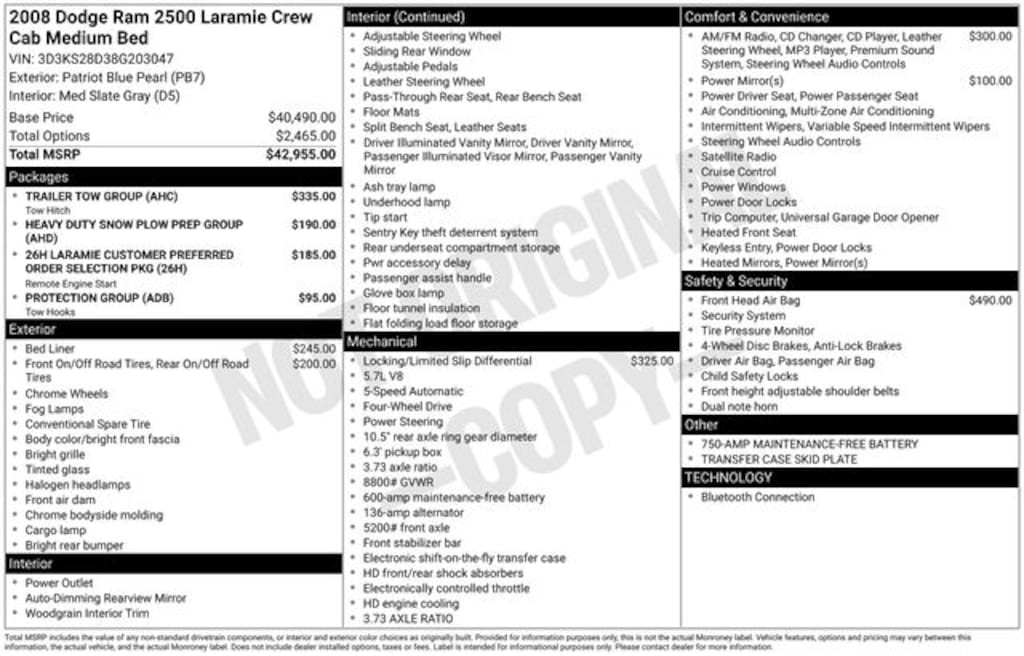 LOCAL TRADE, CLEAN CARFAX, 4WD, HEMI 5.7L V8, AUTOMATIC, 26H LARAMIE PACKAGE, PROTECTION GROUP, TRAILER TOW GROUP, HEAVY DUTY SNOW PLOW PREP GROUP, GRAY LEATHER BENCH SEAT, HEATED SEATS, POWER SEATS, BLUETOOTH, SIRIUSXM, 7 INFINITY SPEAKERS, ANTI SPIN DIFFERENTIAL REAR AXLE, POWER BLACK TRAILER TOW MIRRORS, REMOTE START, REMOTE KEYLESS ENTRY, SIDE STEPS, CLASS IV TOW HITCH, 17" ALUMINUM CHROME CLAD WHEELS, 6 FOOT CARGO BOX, 34 GALLON FUEL TANK, 160 Amp Alternator, 17" x 8" Chrome Clad Aluminum Wheels, 3.73 Axle Ratio, 4-Wheel Disc Brakes, 40/20/40 Split Bench Seat, 7 Pin Wiring Harness, 7 Speakers, ABS brakes, Adjustable pedals, Air Conditioning, AM/FM Compact Disc w/SIRIUS Satellite, AM/FM radio: SIRIUS, Anti-Spin Differential Rear Axle, Auto-dimming Rear-View mirror, Bodyside moldings, Bumpers: body-color, CD player, Class IV Receiver Hitch, Compass, Delay-off headlights, Driver door bin, Driver vanity mirror, Dual front impact airbags, Electronically Controlled Throttle, Folding Flat Load Floor Storage, Front Air Close Out Panel, Front Center Armrest w/Storage, Front Center Seat Cushion Storage, Front dual zone A/C, Front fog lights, Front reading lights, Garage door transmitter, HD Snow Plow Prep Group, Heated door mirrors, Heated front seats, Hood Insulation, Illuminated entry, Leather steering wheel, Leather Trim 40/20/40 Bench Seat, Low tire pressure warning, Mini Floor Console, Next Generation Engine Controller, Outside temperature display, Overhead console, Panic alarm, Passenger door bin, Passenger vanity mirror, Power door mirrors, Power driver seat, Power Fold-Away Trailer Tow Mirrors, Power passenger seat, Power steering, Power windows, Protection Group, Quick Order Package 26H Laramie, Rear 60/40 Split Folding Seat, Rear step bumper, Remote keyless entry, Remote Start System, Security system, SIRIUS Satellite Radio, Speed control, Speed-Sensitive Wipers, Split folding rear seat, Steering wheel mounted audio controls, Supplemental Side Airbags, Tilt steering wheel, Tip Start, Trailer Tow Group, Under Rail Box Bedliner, Variably intermittent wipers.