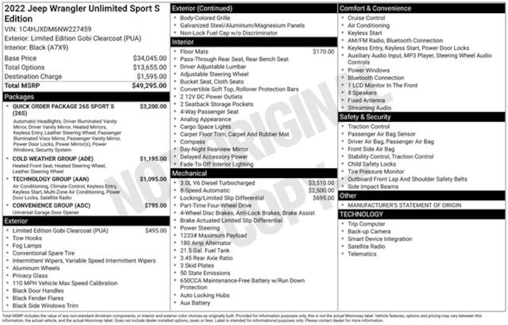 JEEP CERTIFIED!, ONE OWNER, LOCAL TRADE, CLEAN CARFAX, 4WD, 3.0L V6 TURBODIESEL, AUTOMATIC, BLACK SOFT TOP, 26S PACKAGE, TECHNOLOGY GROUP, COLD WEATHER GROUP, CONVENIENCE GROUP, BLACK CLOTH BUCKET SEATS, HEATED SEATS, REMOTE START, HEATED STEERING WHEEL, REAR VIEW CAMERA, REMOTE KEYLESS ENTRY, FRONT DOOR PASSIVE ENTRY AND LOCK, POWER WINDOWS AND LOCKS, UCONNECT 4 WITH 7" TOUCH SCREEN DISPLAY, BLUETOOTH, SIRIUSXM, APPLE CARPLAY & GOOGLE ANDROID AUTO, SIDE STEPS, TOW HITCH, 17" TECH SILVER ALUMINUM WHEELS, 110 MPH Vehicle Max Speed Calibration, 2-Door Passive Entry, Front Door Locks, 4-Wheel Disc Brakes, 8 Speakers, ABS brakes, Air Conditioning w/Auto Temperature Control, Air Filtering, AM/FM radio, Anti-Spin Differential Rear Axle, Apple CarPlay/Android Auto, Automatic Headlamps, Aux Battery, Brake assist, Cloth Low-Back Bucket Seats, Cluster 7.0" TFT Color Display, Cold Weather Group, Compass, Convenience Group, Deep Tint Sunscreen Windows, Delay-off headlights, Driver door bin, Driver vanity mirror, Dual front impact airbags, Dual front side impact airbags, Electronic Stability Control, Emergency communication system: SiriusXM Guardian, Engine Oil Cooler, Front 1-Touch Down Power Windows, Front Center Armrest w/Storage, Front fog lights, Front reading lights, Heated Front Seats, Heated Steering Wheel, Integrated roll-over protection, Leather Wrapped Steering Wheel, Low tire pressure warning, Non-Lock Fuel Cap w/o Discriminator, Normal Duty Suspension, Occupant sensing airbag, Outside temperature display, ParkView Rear Back-Up Camera, Passenger door bin, Passenger vanity mirror, Power Heated Mirrors, Power steering, Quick Order Package 26S Sport S, Radio data system, Radio: Uconnect 4 w/7" Display, Rear reading lights, Remote Keyless Entry, Security Alarm, SiriusXM Radio Service, SiriusXM Satellite Radio, Speed control, Speed Sensitive Power Locks, Split folding rear seat, Sport S, Steering wheel mounted audio controls, Stop-Start Dual Battery System, Sun Visors w/Illuminated Vanity Mirrors, Technology Group, Telescoping steering wheel, Tilt steering wheel, Traction control, Universal Garage Door Opener, Variably intermittent wipers, Wheels: 17" x 7.5" Tech Silver Aluminum. 22/29 City/Highway MPG