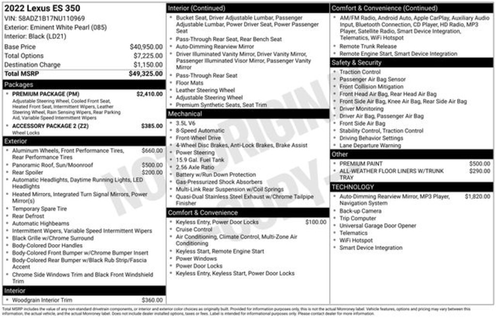 ONE OWNER, LOCAL TRADE, CLEAN CARFAX, FRONT WHEEL DRIVE, 3.5L V6, AUTOMATIC, NAVIGATION PACKAGE, PREMIUM PACKAGE, PANORAMA GLASS ROOF, NAVIGATION SYSTEM WITH 12.3" COLOR MULTIMEDIA DISPLAY, PERFORATED NULUXE SEATS, HEATED/COOLED SEATS, POWER SEATS, WOOD TRIM, SMART ACCESS CARD KEY, 10 SPEAKER LEXUS PREMIUM SOUND SYSTEM, BLUETOOTH, SIRIUSXM, APPLE CARPLAY & ANDROID AUTO, POWER FOLDING MIRRORS, POWER STEERING WHEEL, INTUITIVE PARKING ASSIST, WIRELESS CHARGER, PRECOLLISION SYSTEM WITH PEDESTRIAN DETECTION, ALL SPEED DYNAMIC RADAR CRUISE CONTROL, LANE TRACING ASSIST, LANE DEPARTURE ALERT WITH STEERING ASSIST, INTELLIGENT HIGH BEAMS, ROAD SIGN ASSIST, BLIND SPOT MONITOR WITH REAR CROSS TRAFFIC ALERT, REAR SPOILER, 10 Speakers, 10-Way Power Adjustable Front Seats, 4-Wheel Disc Brakes, ABS brakes, Accessory Package 2 (PPO), Air Conditioning, All-Weather Floor Liners w/Trunk Tray (PPO), Alloy Wheel Locks, AM/FM radio: SiriusXM, Apple CarPlay/Android Auto, Auto High-beam Headlights, Auto-dimming door mirrors, Auto-dimming Rear-View mirror, Automatic temperature control, Brake assist, Bumpers: body-color, Cargo Net (PPO), Carpet Trunk Mat (PPO), CD player, Compass, Delay-off headlights, Driver door bin, Driver vanity mirror, Dual front impact airbags, Dual front side impact airbags, Electrochromic Rear-View Mirror, Electronic Stability Control, Emergency communication system, Exterior Parking Camera Rear, Four wheel independent suspension, Front Bucket Seats, Front Center Armrest, Front dual zone A/C, Front reading lights, Fully automatic headlights, Garage door transmitter: HomeLink, Heated & Ventilated Seats, Heated door mirrors, Heated Leather 3-Spoke Steering Wheel, Illuminated entry, Key Card, Key Gloves (PPO), Knee airbag, Leather Shift Knob, Leather steering wheel, Low tire pressure warning, Navigation, Occupant sensing airbag, Outside temperature display, Overhead airbag, Overhead console, Panic alarm, Panoramic Glass Roof, Parking Support Alert/Brake, Passenger door bin, Passenger vanity mirror, Perforated NuLuxe Seat Trim, Perforated NuLuxe Seat Trim (LD), Power door mirrors, Power driver seat, Power passenger seat, Power steering, Power Tilt/Telescoping Steering Wheel w/Memory, Power windows, Premium Package, Premium Paint, Radio data system, Radio: Lexus Multimedia System, Rain Sensing Wipers, Rear Bumper Applique, Rear reading lights, Rear seat center armrest, Rear side impact airbag, Rear Spoiler, Rear window defroster, Remote keyless entry, Security system, Speed control, Speed-sensing steering, Steering wheel mounted audio controls, Telescoping steering wheel, Tilt steering wheel, Traction control, Turn signal indicator mirrors, Wheels: 18" x 8J Split-10-Spoke Alloy, Windshield De-Icer, Wireless Charger. 22/32 City/Highway MPG
