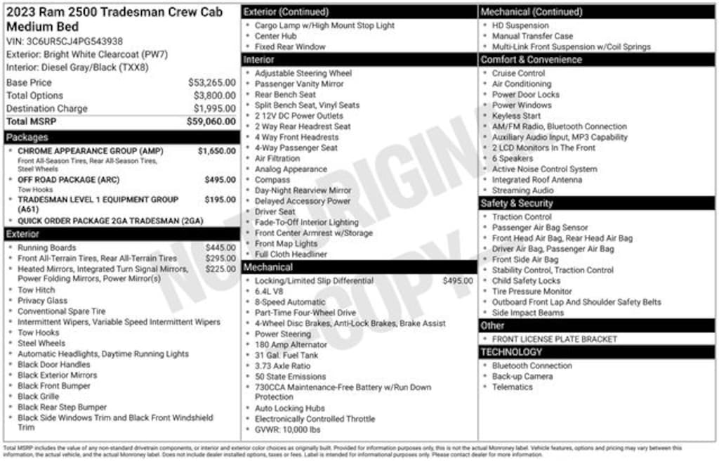 RAM CERTIFIED!, ONE OWNER, CLEAN CARFAX, 4WD, 6.4L V8 HEAVY DUTY HEMI, AUTOMATIC, 2GA PACKAGE, CHROME APPEARANCE GROUP, TRADESMAN LEVEL 1 EQUIPMENT GROUP, OFF ROAD PACKAGE, POWER TELESCOPING MIRRORS, ANTI SPIN DIFFERENTIAL REAR AXLE, BLACK TUBULAR SIDE STEPS BY MOPAR, HEAVY DUTY VINYL BENCH SEAT, REAR VIEW CAMERA, UCONNECT 3 WITH 5" TOUCH SCREEN DISPLAY, CLASS V TOW HITCH, 18" STEEL CHROME CLAD WHEELS, BED RACK, 2 Way Rear Headrest Seat, 3.73 Axle Ratio, 4 Way Front Headrests, 4-Wheel Disc Brakes, 40/20/40 Split Bench Seat, 6 Speakers, ABS brakes, Active Noise Control System, Air Conditioning, AM/FM radio, Anti-Spin Differential Rear Axle, Auto Power-Folding Mirrors, Black Exterior Mirrors, Brake assist, Bright Front Bumper, Bright Rear Bumper, Chrome Appearance Group, Chrome Grille Surround, Chrome Headlamp Bezels, Compass, Delay-off headlights, Driver door bin, Dual front impact airbags, Dual front side impact airbags, Electronic Stability Control, Electronically Controlled Throttle, Emergency communication system: SiriusXM Guardian, Exterior Mirrors Courtesy Lamps, Exterior Mirrors w/Heating Element, Exterior Mirrors w/Supplemental Signals, Forward & Reverse Utility Lights, Front Armrest w/Cupholders, Front Center Armrest w/Storage, Front Performance Tuned Shock Absorbers, Front reading lights, Fully automatic headlights, Global Telematics Box Module (TBM), GPS Antenna Input, Heavy Duty Vinyl 40/20/40 Split Bench Seat, Hill Descent Control, Illuminated entry, Integrated Voice Command w/Bluetooth, Low tire pressure warning, Manual Adjust 4-Way Driver Seat, Manual Adjust 4-Way Front Passenger Seat, Manual Folding Exterior Mirrors, Manual Telescoping Mirrors, Matte Black Mesh Grille w/Chrome, Mirror Running Lights, Occupant sensing airbag, Off Road Package, Outside temperature display, Overhead airbag, Overhead console, ParkView Rear Back-Up Camera, Passenger door bin, Passenger vanity mirror, Power Adjust Mirrors, Power Adjustable Convex Aux Mirrors, Power Heated Fold Telescope Mirrors, Power steering, Power Telescoping Mirrors, Power windows, Quick Order Package 2GA Tradesman, Radio data system, Radio: Uconnect 3 w/5" Display, Rear Folding Seat, Rear Performance Tuned Shock Absorbers, Rear step bumper, SiriusXM Radio Service, Speed control, Storage Tray, Tilt steering wheel, Tip Start, Tow Hooks, Traction control, Tradesman Level 1 Equipment Group, Variably intermittent wipers, Wheels: 18" x 8.0" Steel Chrome Clad.