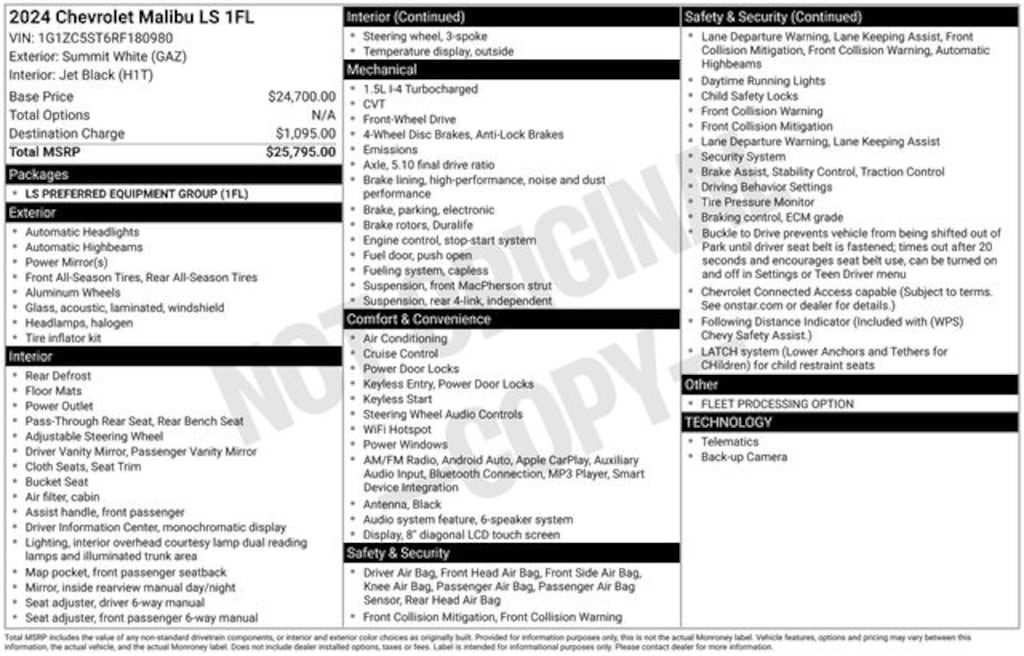 ONE OWNER, CLEAN CARFAX, FRONT WHEEL DRIVE, 1.5L, CVT AUTOMATIC, 1FL GROUP, PREMIUM CLOTH, REAR VIEW CAMERA, REMOTE KEYLESS ENTRY, BLUETOOTH, 16" ALUMINUM WHEELS, 4-Wheel Disc Brakes, 6 Speakers, 6-Speaker Audio System Feature, 6-Way Manual Driver Seat Adjuster, 6-Way Manual Front Passenger Seat Adjuster, ABS brakes, Air Conditioning, AM/FM radio, Auto High-beam Headlights, Brake assist, Bumpers: body-color, Compass, Delay-off headlights, Driver door bin, Driver vanity mirror, Dual front impact airbags, Dual front side impact airbags, Electronic Stability Control, Emergency communication system: OnStar and Chevrolet connected services capable, Exterior Parking Camera Rear, Four wheel independent suspension, Front Bucket Seats, Front Center Armrest, Front reading lights, Fully automatic headlights, Illuminated entry, Knee airbag, Low tire pressure warning, Occupant sensing airbag, Outside temperature display, Overhead airbag, Overhead console, Panic alarm, Passenger door bin, Passenger vanity mirror, Power door mirrors, Power steering, Power windows, Preferred Equipment Group 1FL, Premium audio system: Chevrolet Infotainment 3, Premium Cloth Seat Trim, Radio data system, Radio: Chevrolet Infotainment 3 System, Rear side impact airbag, Rear window defroster, Remote keyless entry, Security system, Speed control, Split folding rear seat, Steering wheel mounted audio controls, Telescoping steering wheel, Tilt steering wheel, Traction control, Variably intermittent wipers, Wireless Apple CarPlay/Android Auto. 28/36 City/Highway MPG