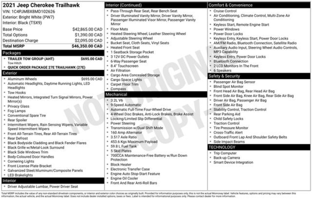 4WD, 3.2L V6, AUTOMATIC, 27E PACKAGE, TRAILER TOW GROUP, REAR VIEW CAMERA, REAR PARK ASSIST, BLIND SPOT MONITORING AND REAR CROSS PATH DETECTION, HEATED STEERING WHEEL, REMOTE START, REMOTE PROXIMITY KEYLESS ENTRY, UCONNECT 4 WITH 8.4" DISPLAY, BLUETOOTH, SIRIUSXM, APPLE CARPLAY & GOOGLE ANDROID AUTO, CLASS III TOW HITCH, 17" BLACK ALUMINUM WHEELS, 3.517 Axle Ratio, 4-Wheel Disc Brakes, 6 Speakers, 7 & 4 Pin Wiring Harness, ABS brakes, Air Conditioning, AM/FM radio: SiriusXM, Anti-whiplash front head restraints, Apple CarPlay/Android Auto, Automatic temperature control, AutoStick Automatic Transmission, Auxiliary Transmission Oil Cooler, Brake assist, Class III Receiver Hitch, Cloth/Premium Vinyl Bucket Seats, Compass, Delay-off headlights, Driver door bin, Driver vanity mirror, Dual front impact airbags, Dual front side impact airbags, Electronic Stability Control, Four wheel independent suspension, Front Bucket Seats, Front Center Armrest, Front dual zone A/C, Front fog lights, Front reading lights, Fully automatic headlights, Heated door mirrors, Heated front seats, Heated steering wheel, Hill Descent Control, Illuminated entry, Knee airbag, Leather Shift Knob, Low tire pressure warning, Occupant sensing airbag, Off Road Suspension, Outside temperature display, Overhead airbag, Overhead console, Panic alarm, ParkView Rear Back-Up Camera, Passenger vanity mirror, Power door mirrors, Power driver seat, Power steering, Power windows, Quick Order Package 27E Trailhawk, Radio data system, Radio: Uconnect 4 w/8.4" Display, Rain sensing wipers, Rear reading lights, Rear seat center armrest, Rear side impact airbag, Rear window defroster, Rear window wiper, Remote keyless entry, Speed control, Speed-sensing steering, Split folding rear seat, Spoiler, Steering wheel mounted audio controls, Telescoping steering wheel, Tilt steering wheel, Traction control, Trailer Tow Group, Trailer Tow Wiring Harness, Turn signal indicator mirrors, Wheels: 17" x 7.5" Black Painted Aluminum.