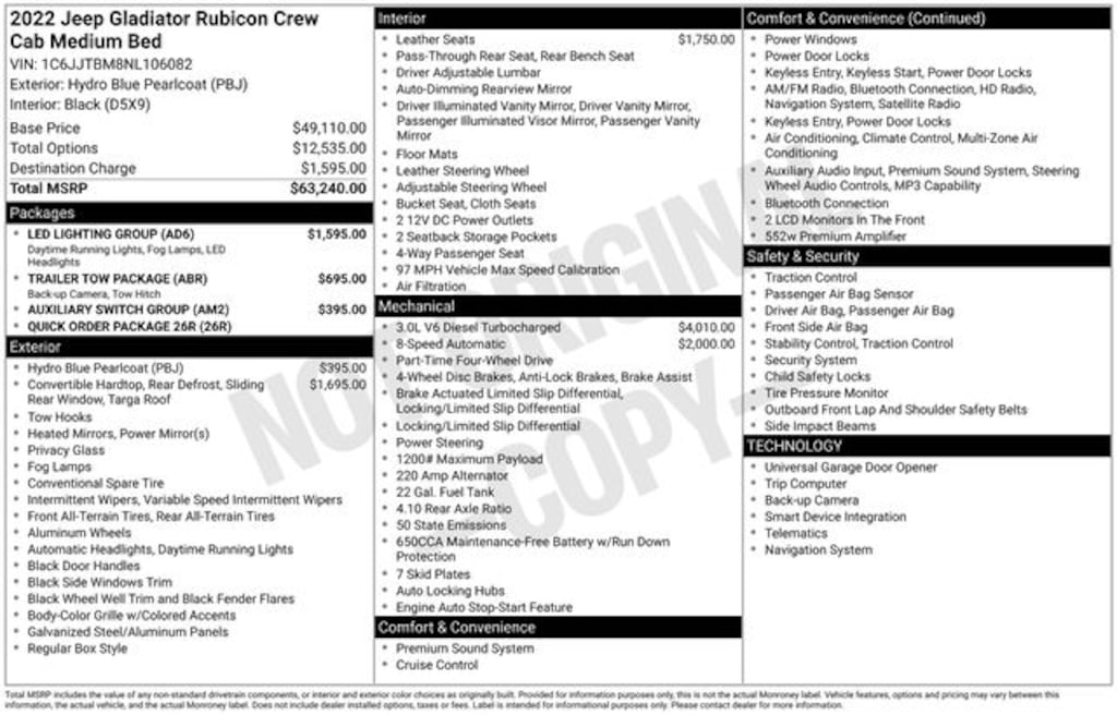 ONE OWNER, LOCAL TRADE, 4WD, 3.0L V6 TURBODIESEL, AUTOMATIC, BLACK HARD TOP, 26R PACKAGE, TRAILER TOW PACKAGE, LED LIGHTING GROUP, AUXILIARY SWITCH GROUP, BLACK PREMIUM CLOTH, REAR SLIDING WINDOW, UCONNECT 4C NAVIGATION WITH 8.4" TOUCH SCREEN DISPLAY, ALPINE PREMIUM AUDIO SYSTEM, BLUETOOTH, SIRIUSXM, APPLE CARPLAY & GOOGLE ANDROID AUTO, REAR VIEW CAMERA, REMOTE KEYLESS ENTRY, CLASS IV TOW HITCH, 17" GRANITE CRYSTAL ALUMINUM WHEELS, 240 Amp Alternator, 3.73 Rear Axle Ratio, 4-Wheel Disc Brakes, 700 Amp Maintenance Free Battery, 9 Speakers, 97 MPH Vehicle Max Speed Calibration, ABS brakes, Air Conditioning, AM/FM radio: SiriusXM, Apple CarPlay/Android Auto, Auto-dimming Rear-View mirror, Automatic temperature control, Auxiliary Switch Group, Auxiliary Switches, Black 3-Piece Hard Top, Brake assist, Class IV Receiver Hitch, Compass, Daytime Running Lamps LED Accents, Delay-off headlights, Driver door bin, Driver vanity mirror, Dual front impact airbags, Dual front side impact airbags, Electronic Stability Control, Emergency communication system: SiriusXM Guardian, Freedom Panel Storage Bag, Front Bucket Seats, Front Center Armrest w/Storage, Front dual zone A/C, Front fog lights, Front LED Fog Lamps, Front reading lights, Fully automatic headlights, Garage door transmitter, Heated door mirrors, Heavy-Duty Engine Cooling, Illuminated entry, Integrated roll-over protection, Leather steering wheel, LED Lighting Group, LED Park Turn Lamps, LED Premium Reflector Headlamps, LED Taillamps, Low tire pressure warning, MOPAR Black Stitched Leather Upgrade, Navigation System, Occupant sensing airbag, Outside temperature display, Panic alarm, ParkView Rear Back-Up Camera, Passenger door bin, Passenger vanity mirror, Performance Suspension, Power door mirrors, Power steering, Power windows, Premium Cloth Low-Back Bucket Seats, Quick Order Package 26R, Radio data system, Radio: Uconnect 4C Nav w/8.4" Display, Rear reading lights, Rear Sliding Window, Rear Window Defroster, Remote keyless entry, Security system, Speed control, Split folding rear seat, Steering wheel mounted audio controls, Telescoping steering wheel, Tilt steering wheel, Traction control, Trailer Hitch Zoom, Trailer Tow Package, Variably intermittent wipers, Wheels: 17" x 7.5" Granite Crystal Aluminum. 21/27 City/Highway MPG Odometer is 5015 miles below market average!