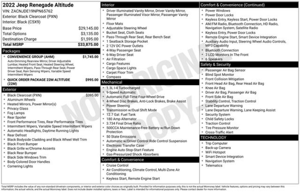 ONE OWNER, LOCAL TRADE, CLEAN CARFAX, 4WD, 1.3L TURBO, AUTOMATIC, 22M PACKAGE, ALTITUDE PACKAGE, CONVENIENCE GROUP, UCONNECT 4C NAVIGATION WITH 8.4" TOUCH SCREEN DISPLAY, BLUETOOTH, SIRIUSXM, APPLE CARPLAY & GOOGLE ANDROID AUTO, 6 SPEAKERS, BLACK DELUXE CLOTH BUCKET SEATS, HEATED SEATS, POWER SEAT, HEATED STEERING WHEEL, LANE DEPARTURE WARNING PLUS, FORWARD COLLISION WARNING PLUS, BLIND SPOT AND CROSS PATH DETECTION, REAR VIEW CAMERA, REMOTE START, 18" GLOSS BLACK WHEELS, 115V Auxiliary Power Outlet, 3.734 Final Drive Ratio, 4-Wheel Disc Brakes, 40/20/40 Rear Seat w/Trunk Pass-Thru, 6 Speakers, ABS brakes, Air Conditioning, Altitude Package, AM/FM radio: SiriusXM, Anti-whiplash front head restraints, Apple CarPlay/Android Auto, Auto-Dimming Rear-View Mirror, Automatic temperature control, Black Accent Stitching, Black Headliner, Brake assist, Compass, Convenience Group, Delay-off headlights, Deluxe Cloth High-Back Bucket Seats, Driver door bin, Driver vanity mirror, Dual front impact airbags, Dual front side impact airbags, Electronic Stability Control, Emergency communication system: SiriusXM Guardian, Four wheel independent suspension, Front Bucket Seats, Front Center Armrest, Front dual zone A/C, Front fog lights, Front reading lights, Fully automatic headlights, Gloss Black Exterior Accents, Gloss Black Steering Wheel Bezel, Heated door mirrors, Heated Front Seats, Heated Steering Wheel, Illuminated entry, Knee airbag, Low tire pressure warning, Navigation System, Normal Duty Suspension, Occupant sensing airbag, Outside temperature display, Overhead airbag, Panic alarm, ParkView Rear Back-Up Camera, Passenger door bin, Passenger vanity mirror, Power 2-Way Driver Lumbar Adjust, Power Adjust 8-Way Driver Seat, Power door mirrors, Power steering, Power windows, Quick Order Package 22M Altitude, Radio data system, Radio: Uconnect 4C Nav w/8.4" Display, Rain Sensitive Windshield Wipers, Rear window defroster, Rear window wiper, Remote keyless entry, Roof rack: rails only, Security system, Speed control, Split folding rear seat, Spoiler, Steering wheel mounted audio controls, Telescoping steering wheel, Tilt steering wheel, Traction control, Wheels: 18" x 8.0" Gloss Black, Windshield Wiper De-Icer. 23/29 City/Highway MPG Odometer is 12598 miles below market average!