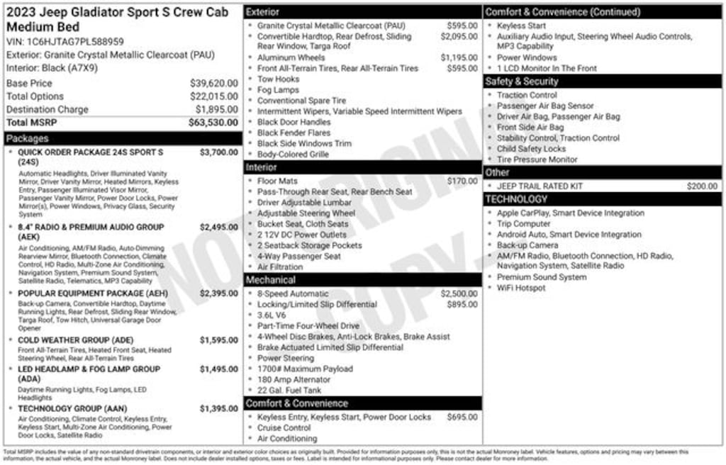 ONE OWNER, CLEAN CARFAX, 4WD, 3.6L V6, AUTOMATIC, BLACK HARD TOP, 24S PACKAGE, 8.4" RADIO AND PREMIUM AUDIO GROUP, TECHNOLOGY GROUP, LED HEADLAMP AND FOG LAMP GROUP, COLD WEATHER GROUP, POPULAR EQUIPMENT PACKAGE, TRAILER TOW PACKAGE, UCONNECT 4C NAVIGATION WITH 8.4" TOUCH SCREEN DISPLAY, ALPINE PREMIUM AUDIO SYSTEM, BLUETOOTH, SIRIUSXM, APPLE CARPLAY & GOOGLE ANDROID AUTO, FRONT DOOR PASSIVE ENTRY, BLACK CLOTH BUCKET SEATS, HEATED SEATS, HEATED STEERING WHEEL, REMOTE START, REAR VIEW CAMERA, ANTI SPIN REAR DIFFERENTIAL, CLASS IV TOW HITCH, 17" GLOSS BLACK ALUMINUM WHEELS, 115V Auxiliary Power Outlet, 3.73 Rear Axle Ratio, 4-Wheel Disc Brakes, 400W Inverter, 4G LTE Wi-Fi Hot Spot, 8 Speakers, 8.4" Radio & Premium Audio Group, 8.4" Touchscreen Display, ABS brakes, Air Conditioning w/Auto Temperature Control, Alpine Premium Audio System, AM/FM radio, Anti-Spin Differential Rear Axle, Apple CarPlay/Android Auto, Auto-Dimming Rear-View Mirror, Automatic Headlamps, Black 3-Piece Hard Top, Brake assist, Class IV Receiver Hitch, Cloth Low-Back Bucket Seats, Cluster 7.0" TFT Color Display, Cold Weather Group, Compass, Console Bin Task Light, Convenience Group, Daytime Running Lamp System, Daytime Running Lamps LED Accents, Deep Tint Sunscreen Windows, Delay-off headlights, Driver door bin, Driver vanity mirror, Dual front impact airbags, Dual front side impact airbags, Electronic Stability Control, Emergency communication system, Emergency/Assistance Call, Freedom Panel Storage Bag, Front 1-Touch Down Power Windows, Front Center Armrest w/Storage, Front Door Locks 2-Door Passive Entry, Front Door Locks 2-Door Passive Entry (DISC), Front fog lights, Front LED Fog Lamps, Front reading lights, Google Android Auto, GPS Navigation, HD Radio, Heated Front Seats, Heated Steering Wheel, Heavy-Duty Engine Cooling, Integrated Center Stack Radio, Integrated roll-over protection, Integrated Voice Command w/Bluetooth, Jeep Trail Rated Kit, LED Headlamp & Fog Lamp Group, LED Premium Reflector Headlamps, Low tire pressure warning, Media Hub w/2 Charge Only USBs, Normal Duty Plus Suspension, Normal Duty Suspension, Occupant sensing airbag, Off-Road Info Pages, Outside temperature display, ParkView Rear Back-Up Camera, Passenger door bin, Passenger vanity mirror, Popular Equipment Package, Power Heated Mirrors, Power steering, Power Tailgate Lock, Premium Wrapped Steering Wheel, Quick Order Package 24S Sport S, Radio data system, Radio: Uconnect 4C Nav w/8.4" Display, Rear reading lights, Rear Sliding Window, Rear Window Defroster, Remote Keyless Entry, Security Alarm, SiriusXM Radio Service, SiriusXM Satellite Radio, SiriusXM Traffic Plus, SiriusXM Travel Link, Speed control, Speed Sensitive Power Locks, Split folding rear seat, Sport S, Steering wheel mounted audio controls, Sun Visors w/Illuminated Vanity Mirrors, Technology Group, Telescoping steering wheel, Tilt steering wheel, Traction control, Trailer Hitch Zoom, Trailer Tow Package, Universal Garage Door Opener, USB Host Flip, Variably intermittent wipers, Wheels: 17" x 7.5" Gloss Black Aluminum. Odometer is 46558 miles below market average!