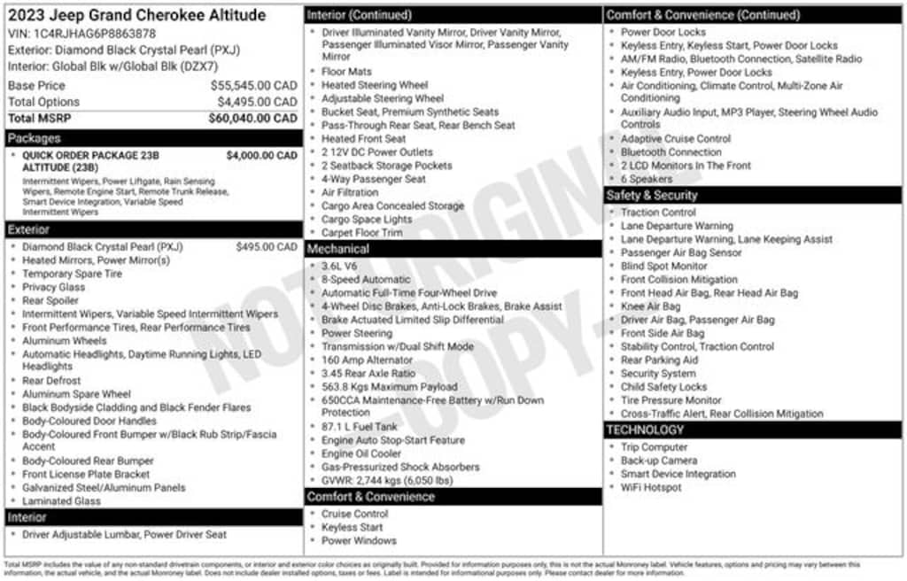 4WD, 3.6L V6, AUTOMATIC, 23B PACKAGE, ALTITUDE APPEARANCE PACKAGE, CAPRI LEATHERETTE SEATS WITH SUEDE INSERTS, HEATED SEATS, POWER SEAT, HEATED STEERING WHEEL, POWER LIFTGATE, BLACK HEADLINER, UCONNECT 5 WITH 8.4" DISPLAY, WIRELESS CHARGING PAD, REMOTE START, ADAPTIVE CRUISE CONTROL, FULL SPEED FORWARD COLLISION WARNING PLUS, ACTIVE LANE MANAGEMENT SYSTEM, BLIND SPOT MONITORING WITH REAR CROSS PATH DETECTION, REAR VIEW CAMERA, REAR PARK ASSIST, 20" GLOSS BLACK ALUMINUM WHEELS, 115V Auxiliary Power Outlet, 3.45 Rear Axle Ratio, 4-Wheel Disc Brakes, 6 Speakers, ABS brakes, Air Conditioning, Altitude Appearance Package, Anti-whiplash front head restraints, Automatic temperature control, Black Headliner, Brake assist, Bumpers: body-color, Capri Leatherette/Suede Seats, Compass, Delay-off headlights, Driver door bin, Driver vanity mirror, Dual front impact airbags, Dual front side impact airbags, Electronic Stability Control, Emergency communication system, Four wheel independent suspension, Front Bucket Seats, Front Center Armrest w/Storage, Front dual zone A/C, Front reading lights, Fully automatic headlights, Gloss Black Exterior Accents, Heated door mirrors, Heated Front Seats, Heated Steering Wheel, Illuminated entry, Knee airbag, Low tire pressure warning, Molded In Color Black/Gloss Black Roof Rails, Normal Duty Suspension, Occupant sensing airbag, Outside temperature display, Overhead airbag, Overhead console, Panic alarm, ParkView Rear Back-Up Camera, Passenger door bin, Passenger vanity mirror, Power door mirrors, Power driver seat, Power Liftgate, Power steering, Power windows, Quick Order Package 23B Altitude, Radio data system, Radio: Uconnect 5 w/8.4" Display, Rain Sensitive Windshield Wipers, Rear reading lights, Rear window defroster, Rear window wiper, Remote keyless entry, Remote Start System, Secondary Active Grille Shutters, Security system, Selectable Tire Fill Alert, Speed control, Split folding rear seat, Spoiler, Steering wheel mounted audio controls, Telescoping steering wheel, Tilt steering wheel, Traction control, Wheels: 18" x 8" Fully Painted Aluminum 1, Wireless Charging Pad. 19/26 City/Highway MPG