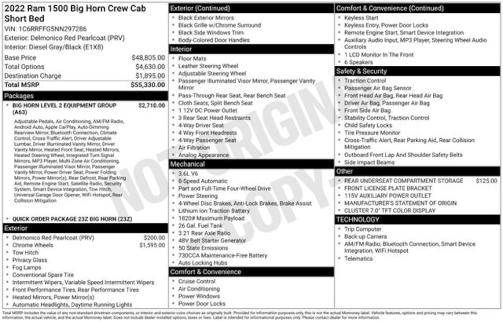 RAM CERTIFIED!, LOCAL TRADE, CLEAN CARFAX, 4WD, 3.6L V6, AUTOMATIC, 23Z BIG HORN PACKAGE, BIG HORN LEVEL 2 EQUIPMENT GROUP, CLOTH BENCH SEAT, HEATED SEATS, POWER SEAT, HEATED SEATS, UCONNECT 5 WITH 8.4" TOUCH SCREEN DISPLAY, BLUETOOTH, SIRIUSXM, APPLE CARPLAY & GOOGLE ANDROID AUTO, 6 SPEAKERS, FRONT/REAR PARK ASSIST, REMOTE START, REAR POWER SLIDING WINDOW, POWER FOLDING MIRRORS, REAR VIEW CAMERA, SIDE STEPS, BED COVER, CLASS IV TOW HITCH, 20" ALUMINUM CHROME CLAD WHEELS, 115V Auxiliary Rear Power Outlet, 2nd Row In Floor Storage Bins, 3 Rear Seat Head Restraints, 3.21 Rear Axle Ratio, 4 Way Front Headrests, 4-Wheel Disc Brakes, 400W Inverter, 48V Belt Starter Generator, 4G LTE Wi-Fi Hot Spot, 6 Speakers, 8.4" Touchscreen Display, ABS brakes, Air Conditioning ATC w/Dual Zone Control, AM/FM radio, Apple CarPlay, Auto-Dimming Exterior Driver Mirror, Auto-Dimming Rear-View Mirror, Big Horn Badge, Big Horn Level 2 Equipment Group, Black Exterior Mirrors, Black Premium Power Mirrors, Bluetooth Handsfree Phone & Audio, Brake assist, Bumpers: chrome, Class IV Receiver Hitch, Cloth Bench Seat, Cluster 7.0" TFT Color Display, Compass, Connectivity - US/Canada, Convex Wide-Angle Mirror Insert, Delay-off headlights, Driver door bin, Dual front impact airbags, Dual front side impact airbags, Electronic Stability Control, Emergency communication system: SiriusXM Guardian, Exterior Mirrors Courtesy Lamps, Exterior Mirrors w/Heating Element, Exterior Mirrors w/Supplemental Signals, For Details, Visit DriveUconnect.com, Front Center Armrest w/Storage, Front fog lights, Front reading lights, Front Seat Back Map Pockets, Front wheel independent suspension, Fully automatic headlights, Global Telematics Box Module (TBM), Glove Box Lamp, Google Android Auto, GPS Antenna Input, Heated door mirrors, Heated Front Seats, Heated Steering Wheel, Heavy-Duty Engine Cooling, Illuminated entry, Integrated Center Stack Radio, Integrated Voice Command w/Bluetooth, Leather steering wheel, Low tire pressure warning, Media Hub w/2 Charge Only USBs, Occupant sensing airbag, Outside temperature display, Overhead airbag, Overhead console, Panic alarm, ParkSense Front/Rear Park Assist w/Stop, ParkView Rear Back-Up Camera, Passenger door bin, Passenger vanity mirror, Power 2-Way Driver Lumbar Adjust, Power 8-Way Driver Seat, Power Adjustable Pedals, Power steering, Power windows, Power-Folding Mirrors, Quick Order Package 23Z Big Horn, Radio data system, Radio: Uconnect 5 W w/8.4" Display, Rear 60/40 Folding Seat, Rear Dome w/On/Off Switch Lamp, Rear Power Sliding Window, Rear seat center armrest, Rear step bumper, Rear Underseat Compartment Storage (DISC), Rear Window Defroster, Remote keyless entry, Remote Start System, Security Alarm, SiriusXM Radio Service, SiriusXM Satellite Radio, Speed control, Split folding rear seat, Steering wheel mounted audio controls, Sun Visors w/Illuminated Vanity Mirrors, Telescoping steering wheel, Tilt steering wheel, Traction control, Universal Garage Door Opener, USB Host Flip, Variably intermittent wipers, Wheels: 20" x 9" Aluminum Chrome Clad (WRK). Odometer is 10134 miles below market average!